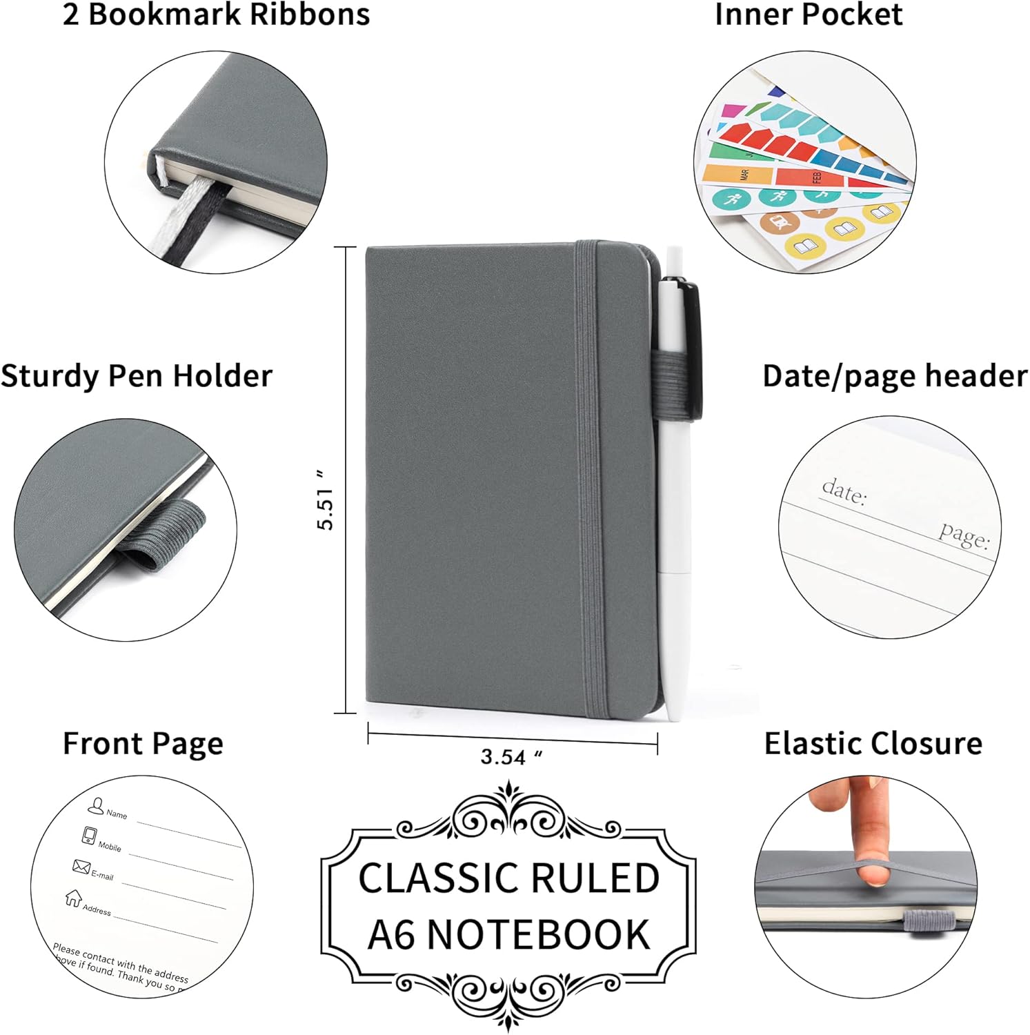 feela 6 Pack Pocket Mini Notebooks Bulk, Small Cute Memo Notepads Hardcover College Ruled Lined Journals with Pen Holder for School Business Work, with 6 Black Pens, 3.5”x 5.5”, A6, Gray