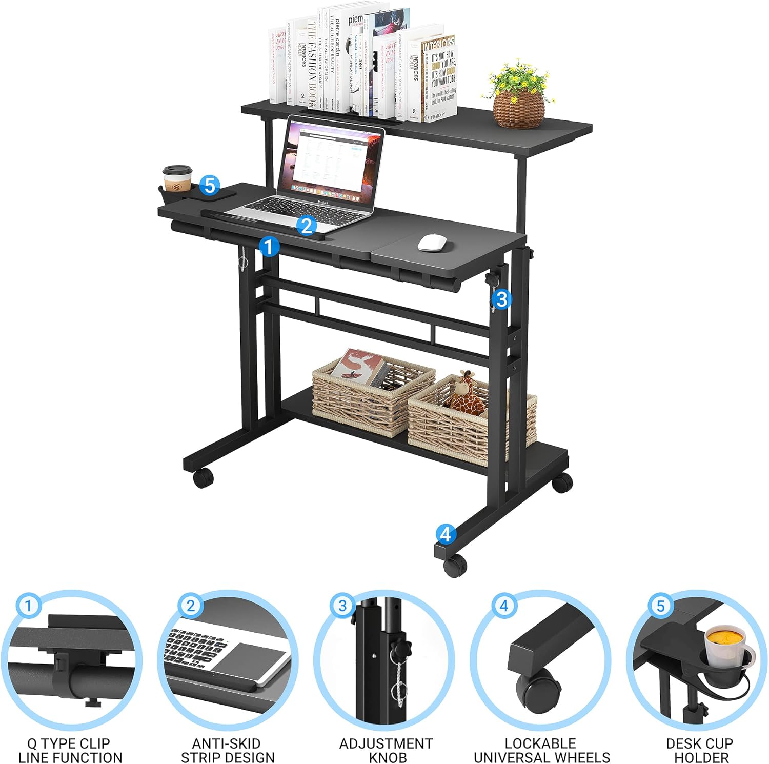 Mobile Standing Desk, Adjustable Rolling Computer Desk with 3 Desktops, Portable Laptop Table with Cup Holder, Home Office Laptop Workstation on Lockable Wheels, Black