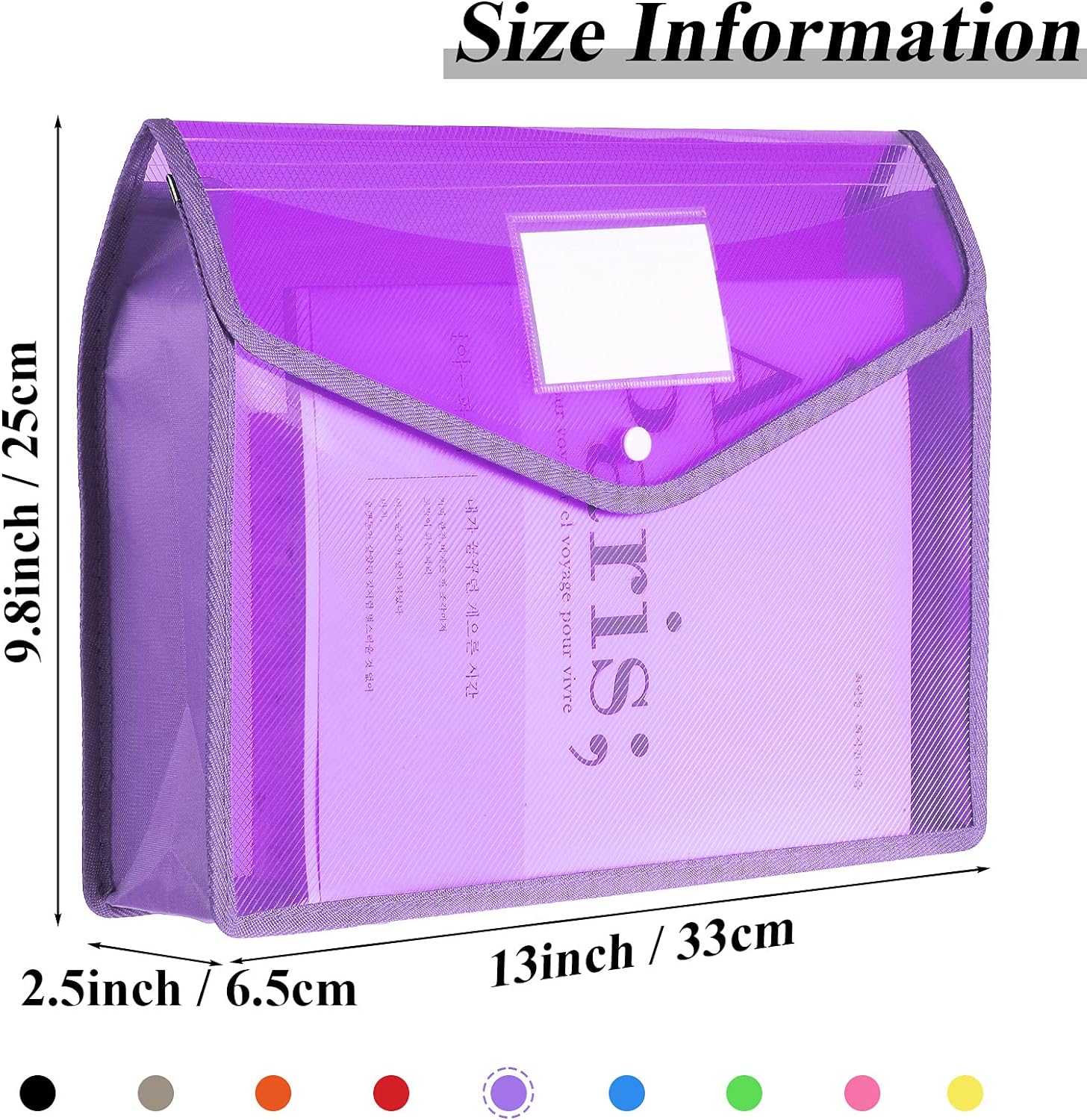- Package content: you will get document folders in 10 different colors (2 black/ 1 blue/ 1 purple/ 1 khaki/1 green/ 1 pink/ 1 orange/ 1 yellow/ 1 red), each A4 document holder folder color is semitransparent design, which makes it easy to organize and distinguish between different file options