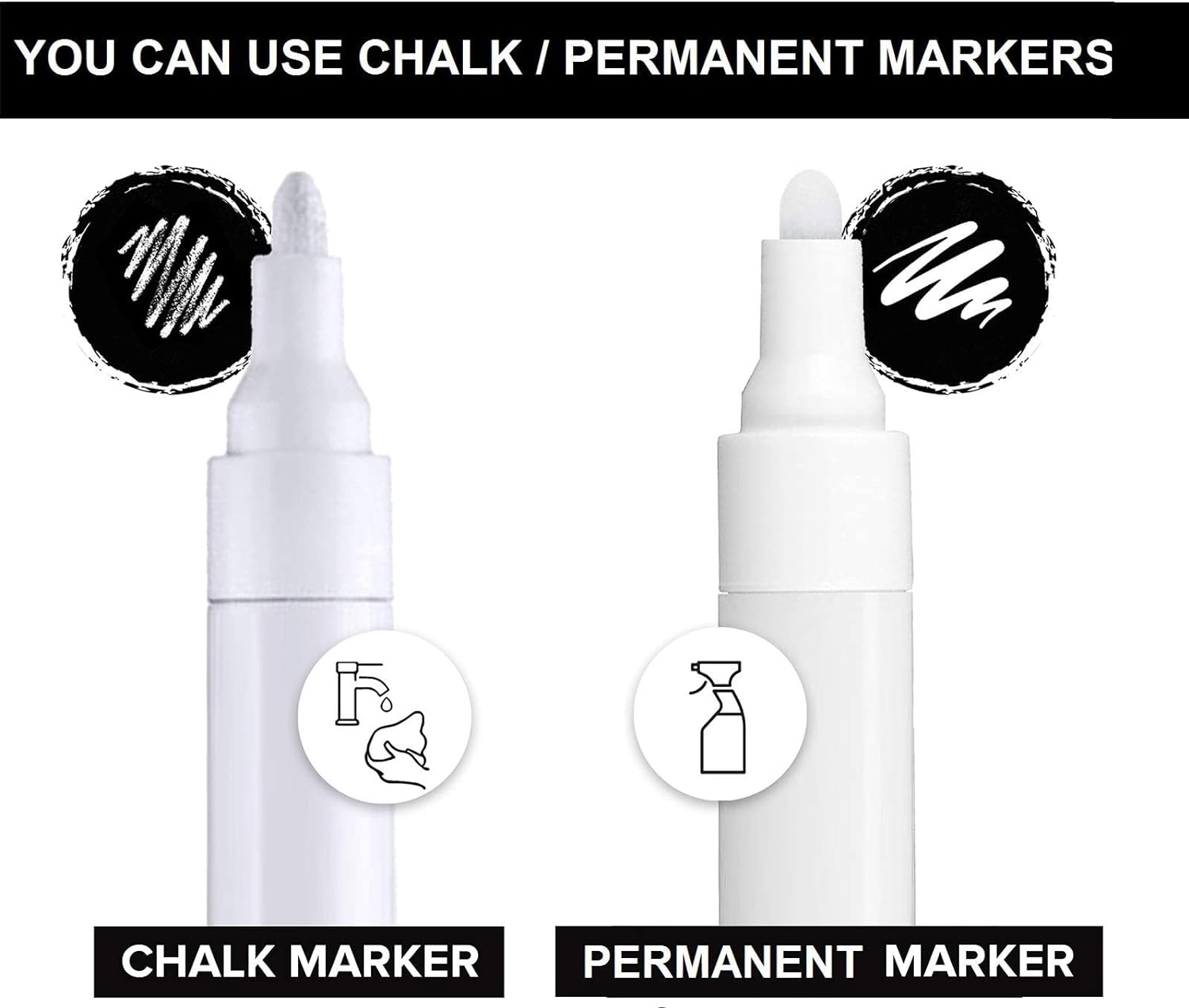 - ✔️ You can use chalk and permanent markers. To wipe out permanent marker, use window cleaner with a napkin (example Windex). To wipe out chalk marker use wet napkin or eraser.