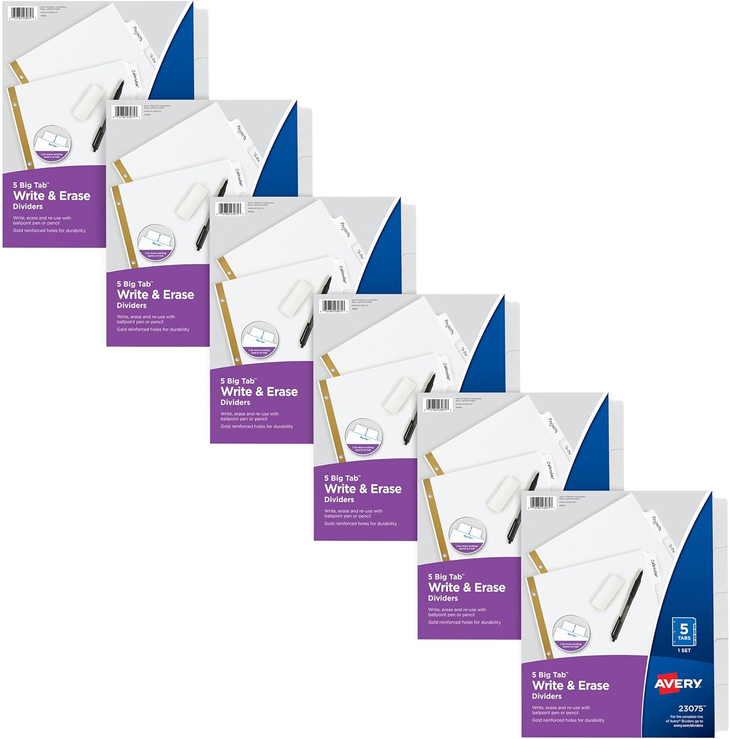Avery Big Tab Write & Erase Dividers for 3 Ring Binders, 5-Tab Sets, 6 Binder Divider Sets (33075)