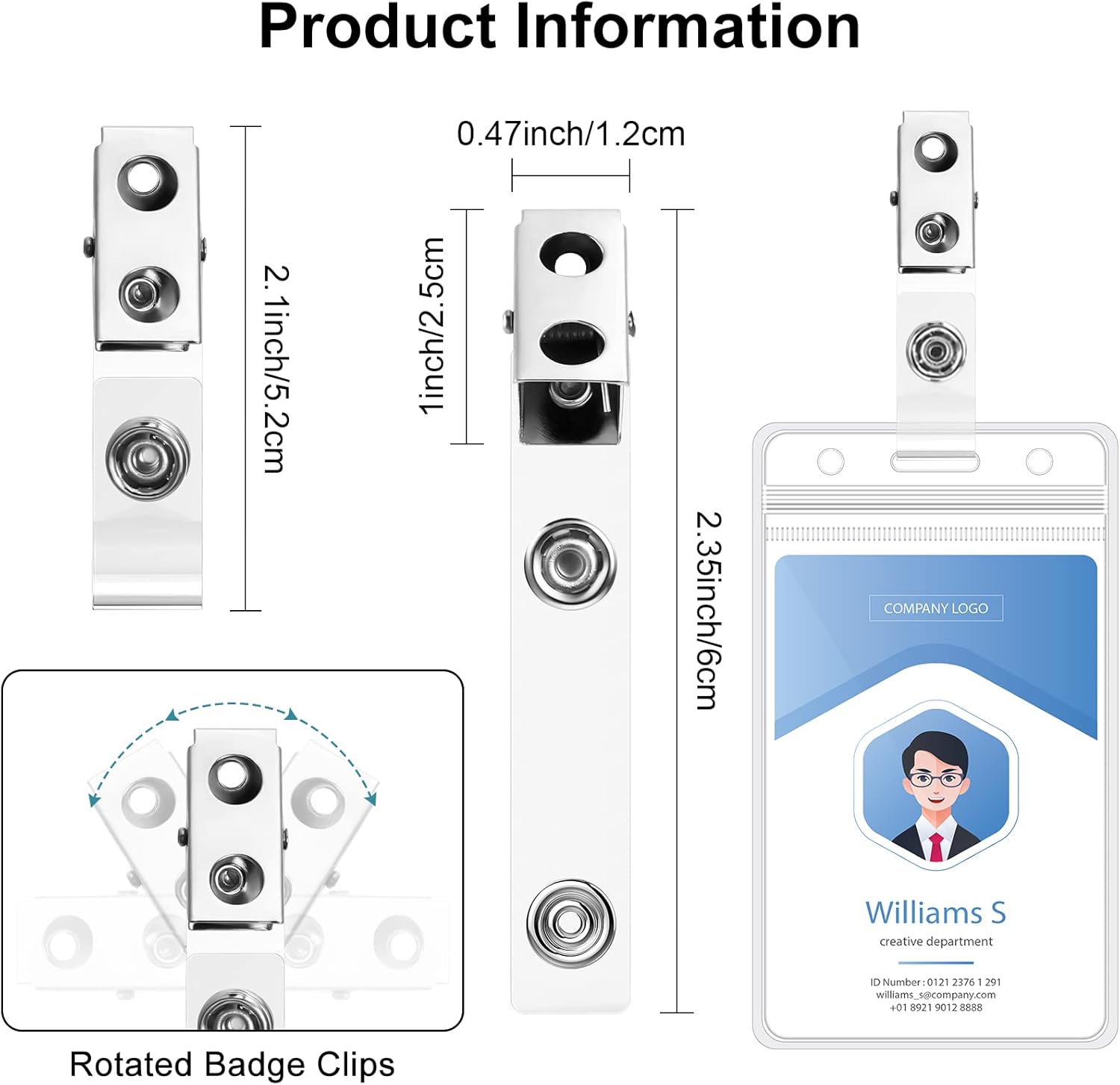 - Easy to apply: the ID badge clips can be rotated 360 degrees, flexible for using, the PVC straps are easy to install or remove, you can use them to attach your card holders to clothes, bags, badge reels and so on; The metal clips have 2 holes that are pre punched, which help you to hang or clip the holder in a variety of ways