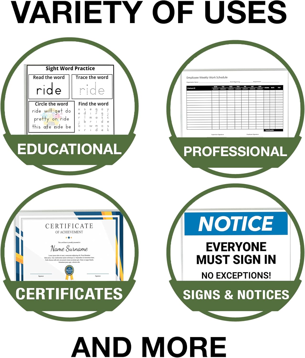 - Dry Erase. Our no-hole sleeves can be used as a reusable dry erase board, allowing you to easily create checklists, notes and more by writing directly on the sheet protector with dry erase markers