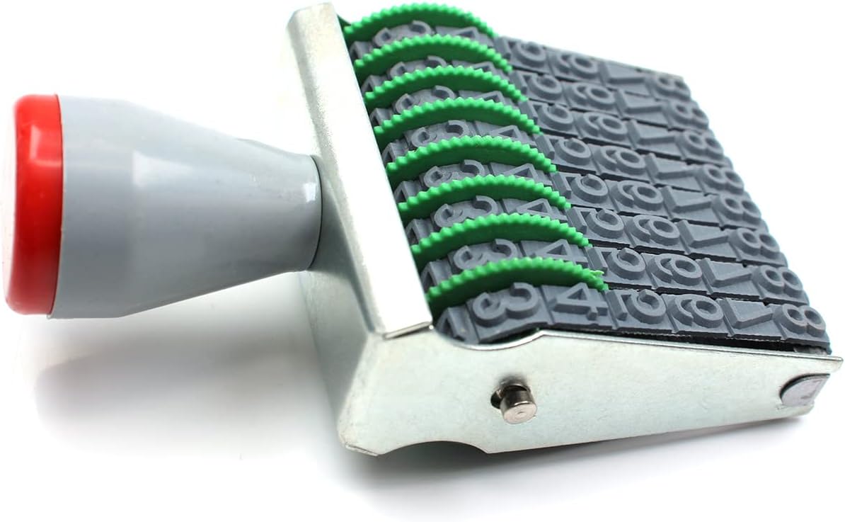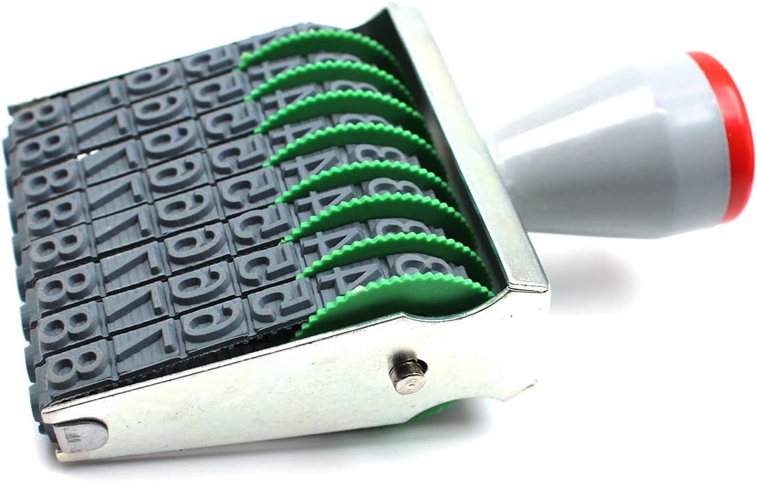 - Nubber stamp: Material : Metal/Plastic. Size:Length :100 mm/3.93 in, Width:58 mm/2.28 in,High:25 mm/0.98 in, Character : Width:5 mm /0.19 in,Height:8 mm/0.31 in, Color : Gray black, Weight: 70 g, Package Content : 1 X Numbering Stamp(Without ink Requires a separate ink pad).