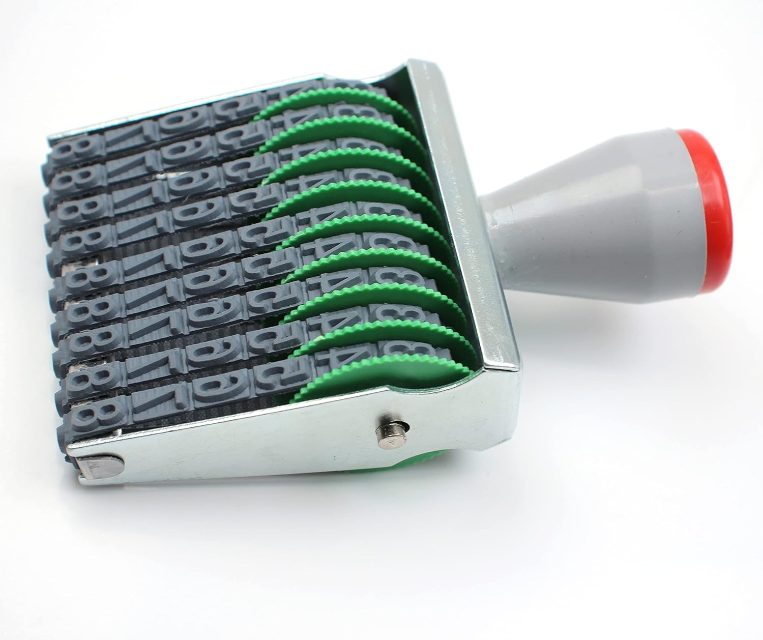 - Rolling stamp,: Material : Metal/Plastic. Size:Length :100 mm/3.93 in, Width:57 mm/2.24 in,High:25 mm/0.98 in,Character : Width:5 mm /0.19 in,Height:7 mm/0.27 in, Color : Gray black,Weight: 75 g. Package Content : 1 X Numbering Stamp(Without ink Requires a separate ink pad).