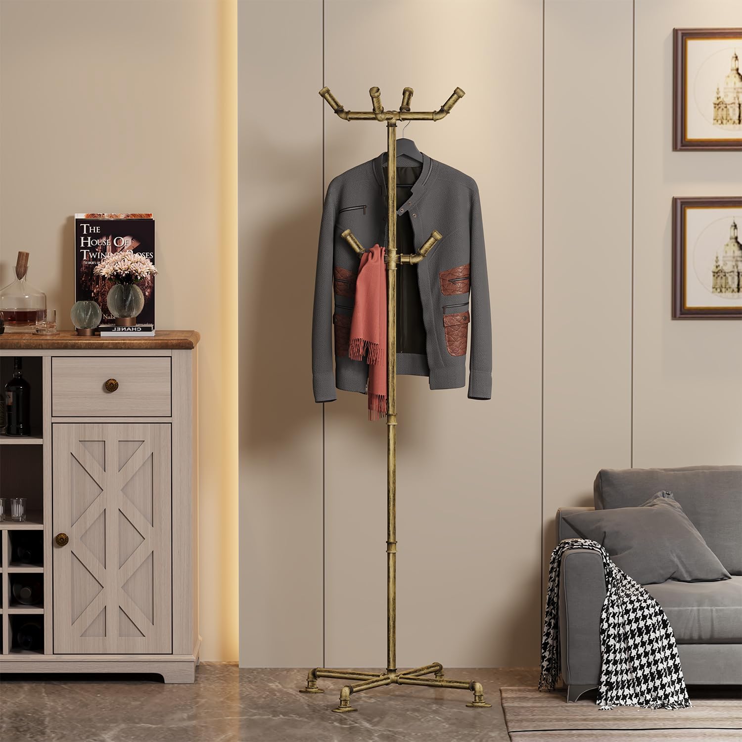 - This coat rack size is about W20*H67 inch & Crafted of 3/4” pipe steel that stronger than other products. An antique gold finish just makes you feel all warm and cozy.