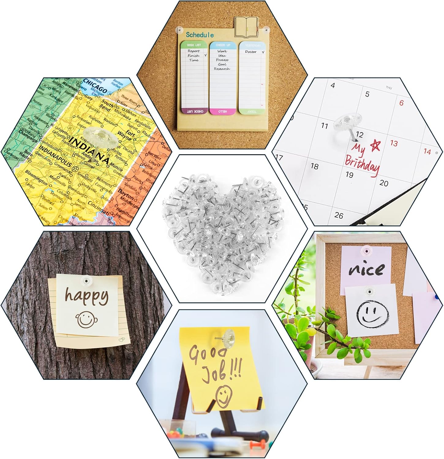 - 1. Premium Flat Push Pins: these clear thumbtacks are composed of plastic head and steel point, sharp and durable, which are not easy to bent or broken short, created to stand years of use.