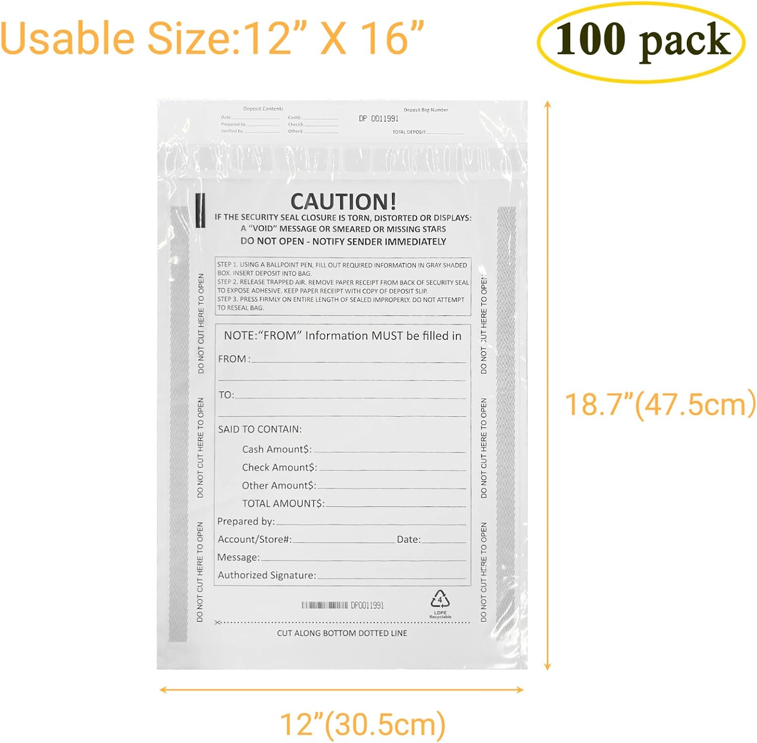 - Size: 12 x 16 Inch (30.5 cm x 40.7 cm). Packaging Contains: 100 pack White Deposit Bags.