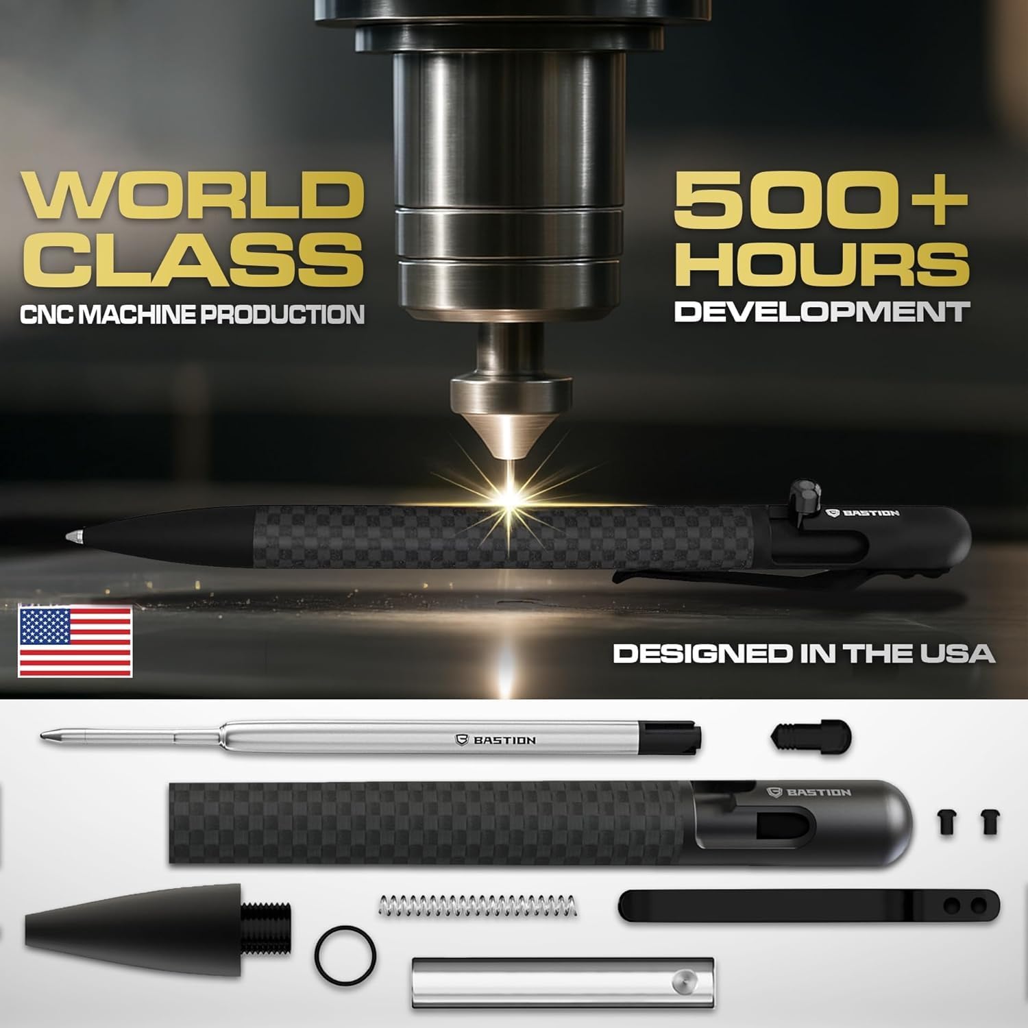 - Bolt Action Mechanism: Our J-shaped bolt action mechanism provides a secure lock with non-wearing parts and a simple one-push operation. BASTION pens combine functionality and elegance with its high-caliber machined CNC precision design. Our pens are a prestige symbol because of their sturdy construction, simple retractable operation, and beautiful appearance.