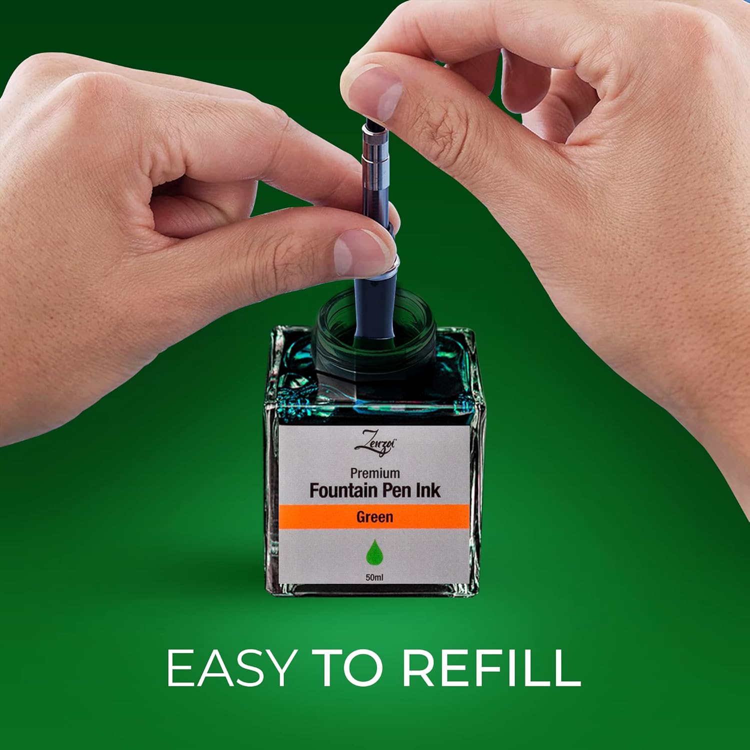 ZenZoi Fountain Pen Ink Bottle 50ml | Premium Designed Bottled Ink for Fountain Pens – Suitable for Calligraphy and All Branded Pens | Quick Drying and Smooth Flow Writing Experience (Green)