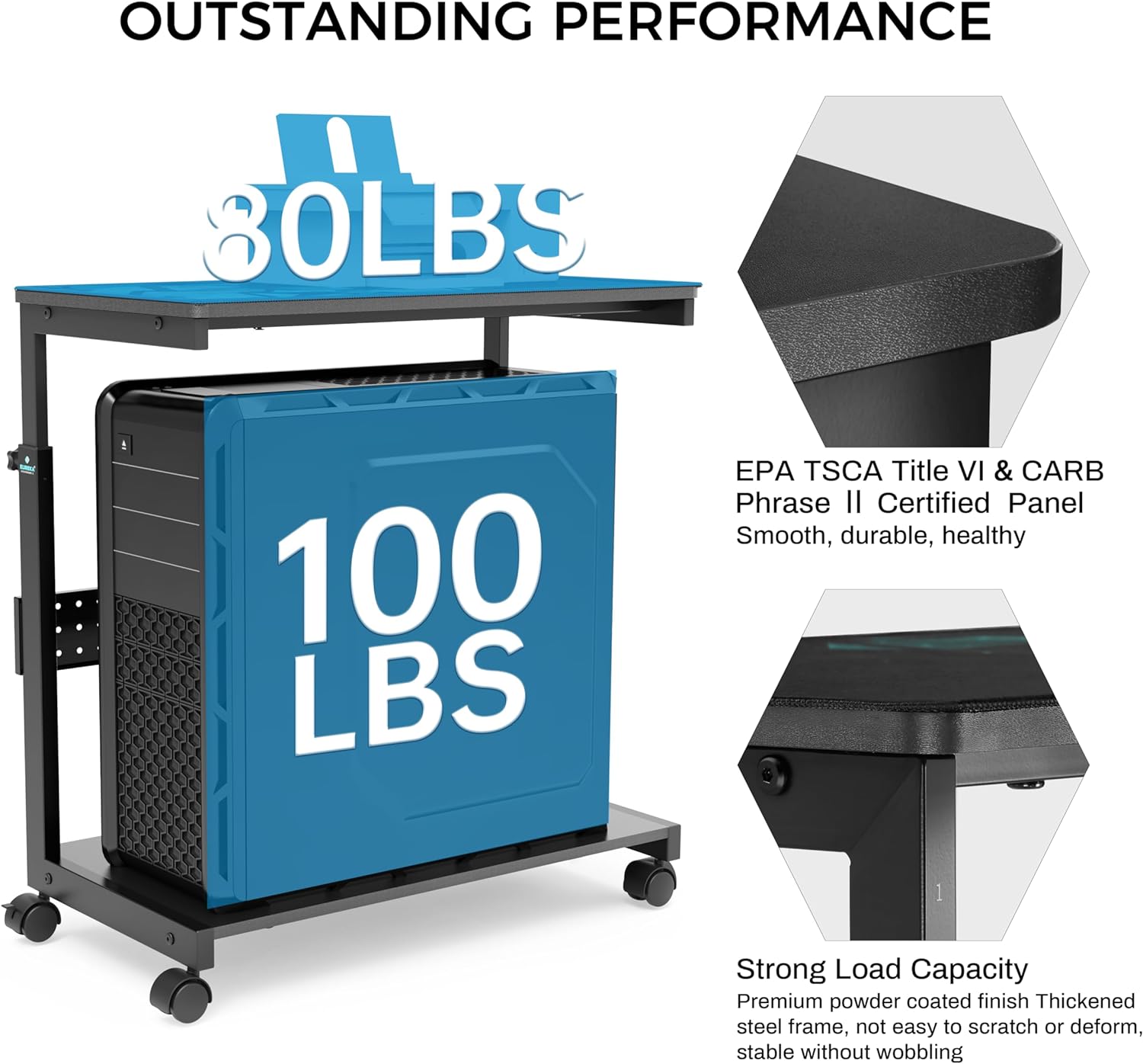 - Sturdy Structure: EPA TSCA Title VI & CARB Phase Ⅱ Certified desktop panel with premium anti-scratch finish. Thickened steel frame with powder-coated finish resists corrosion to ensure stability and durability, is not easy to scratch or deform, no wobbling. The bottom shelf max weight is up to 100 LBS, the top shelf is 80 LBS. NOTE: When moving, the cpu stand can only support up to 80 LBS.