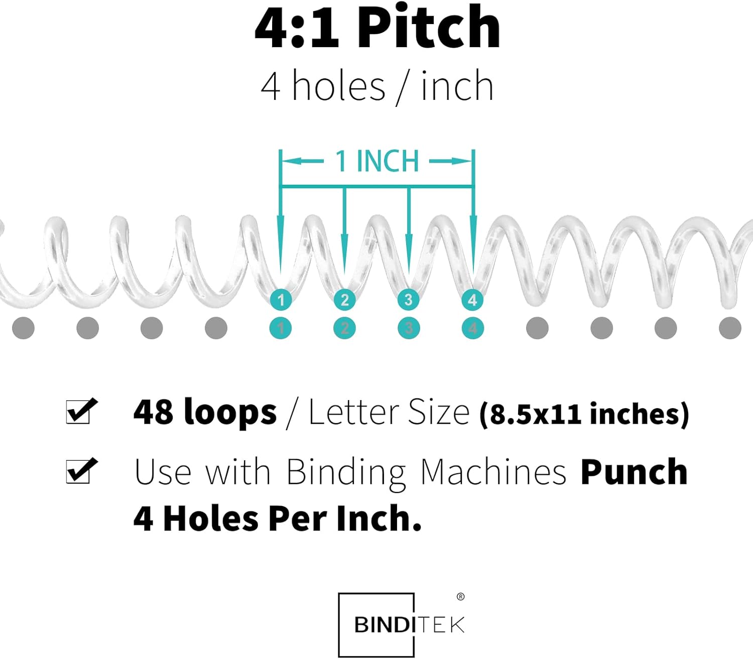 - 【4:1 Pitch & 48 Loops】Spiral binding coils have a 4:1 pitch, making them compatible with any binding machine that punches 4 holes per inch. (Attention: These 4:1 pitch binding coils are not compatible with the Cinch machine.)