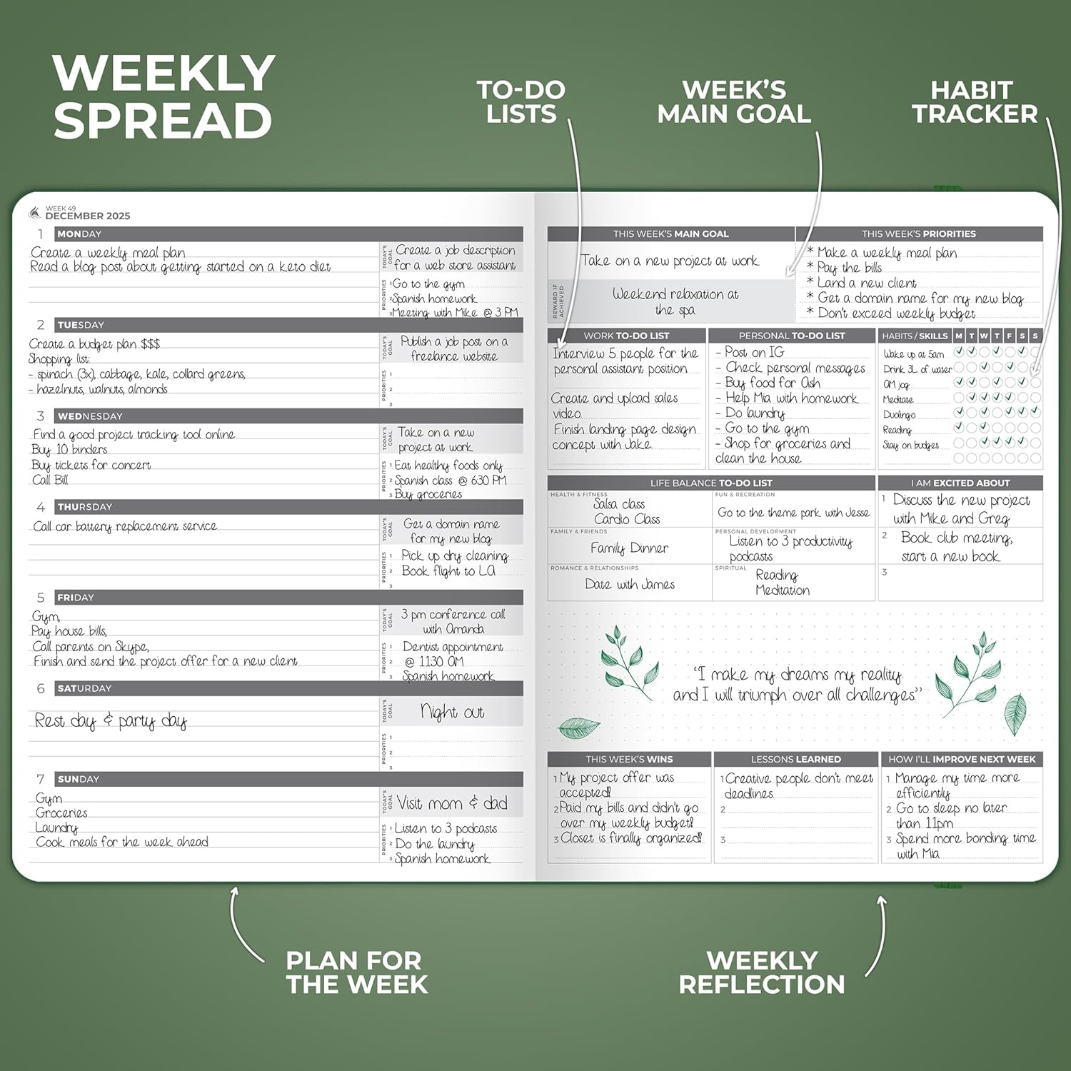 - PLAN YOUR LIFE TO THE TINIEST DETAIL – Convenient large-format layouts include weekly and daily priorities, to-do lists, habit trackers, monthly calendars and progress reviews to help you plan each aspect of your busy life.