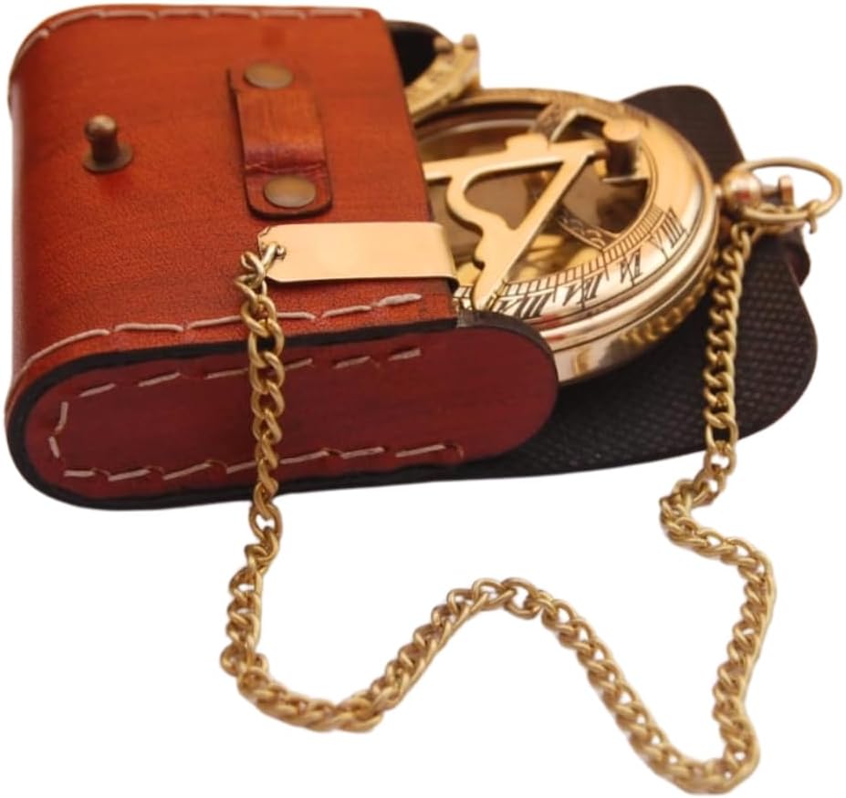 Vintage Brass Sundial Compass with Leather Case - Antique Brass & Copper Sun Clock for Camping, Hiking, Touring - Engraved Gift for Him - Nautical Ship Replica Watch - Sundial Clock in Box