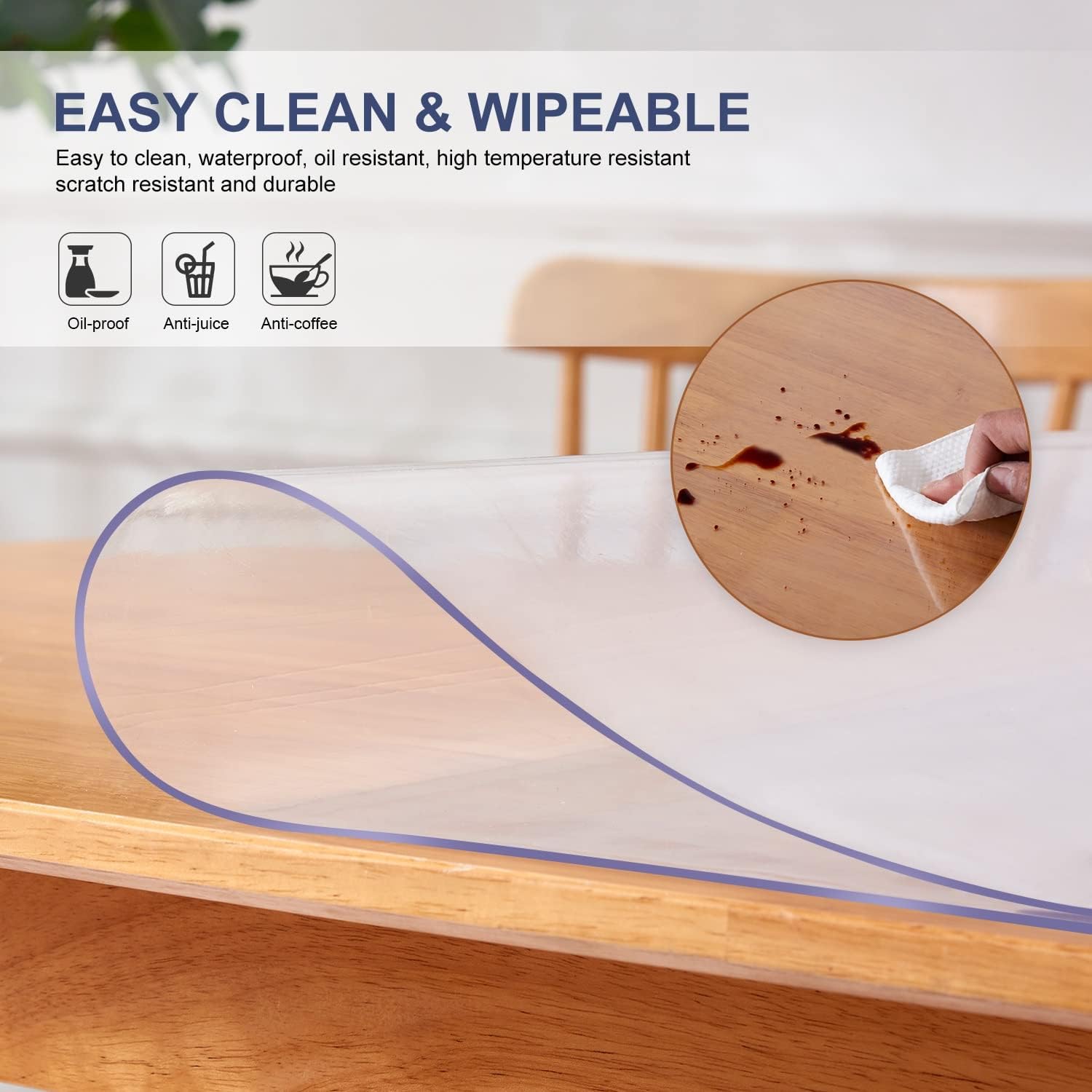 - B.Durable,Wipable, Waterproof and Heat-resistant 1.5mm thickness heavy duty, heat resistance up to 176°F. Use as table runner or desktop mat, to better protect your expensive wooden, glass, granite, marble,or use as office computer or writing desk clear blotter pad, coffee bar or pub dining table pad, cooktop, furniture tops liner against scratches, scuffs, oil stains, coffee spillage, heating scalds; Simply wiping this pvc table cover with a damp cloth that can get all the mess off its surface!