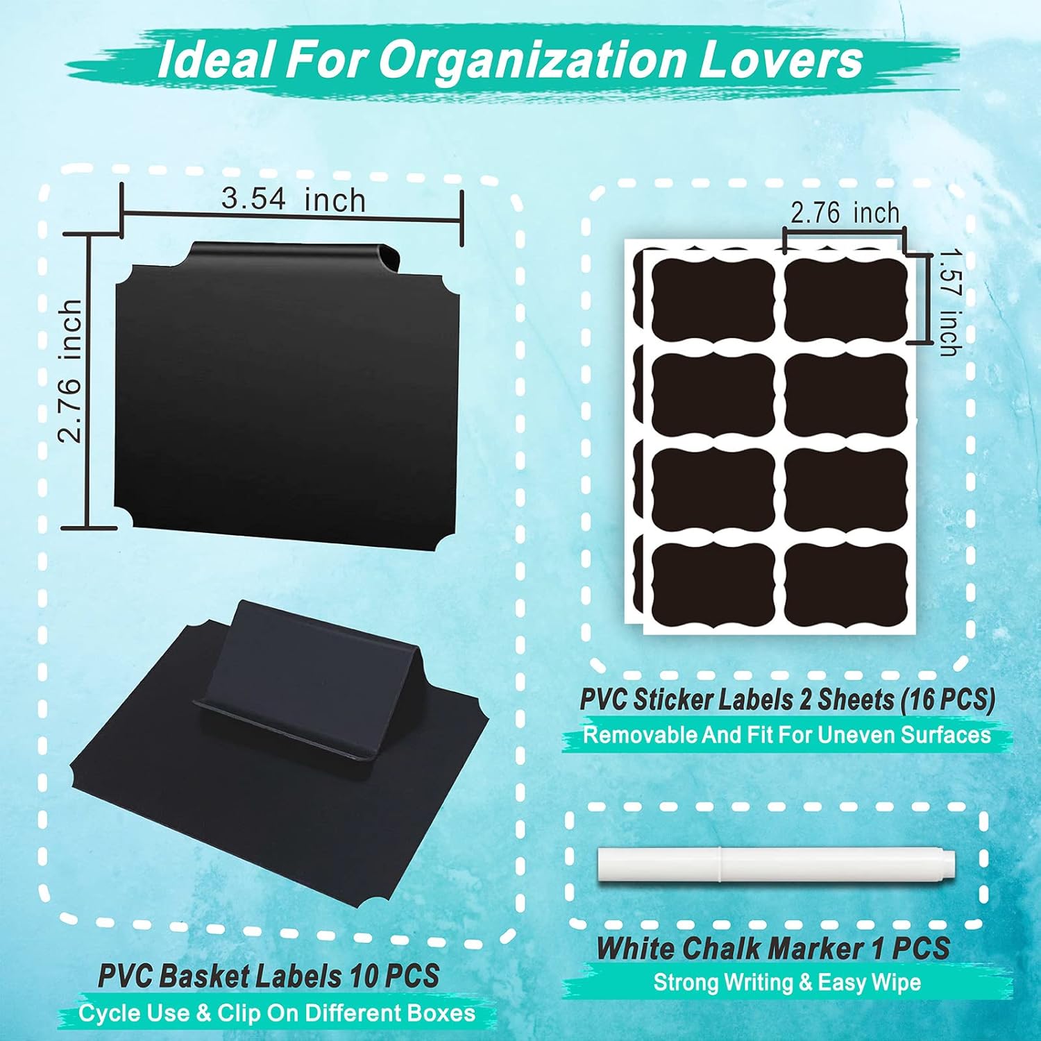 - 【Good-value 27-Piece Organization Kit With Practical Bonuses】- The package comes with plastic basket clip-on labels 10 pcs, white chalk marker 1 pcs and PVC adhesive sticker labels 16 pcs (extra practical bonuses). We're very concerned with your messing problems at home and office. Let's get it solved easily: make this economical purchase and get everthing organized back and create a more functional storage system. This organizing set can meet your daily use and replacement completely.