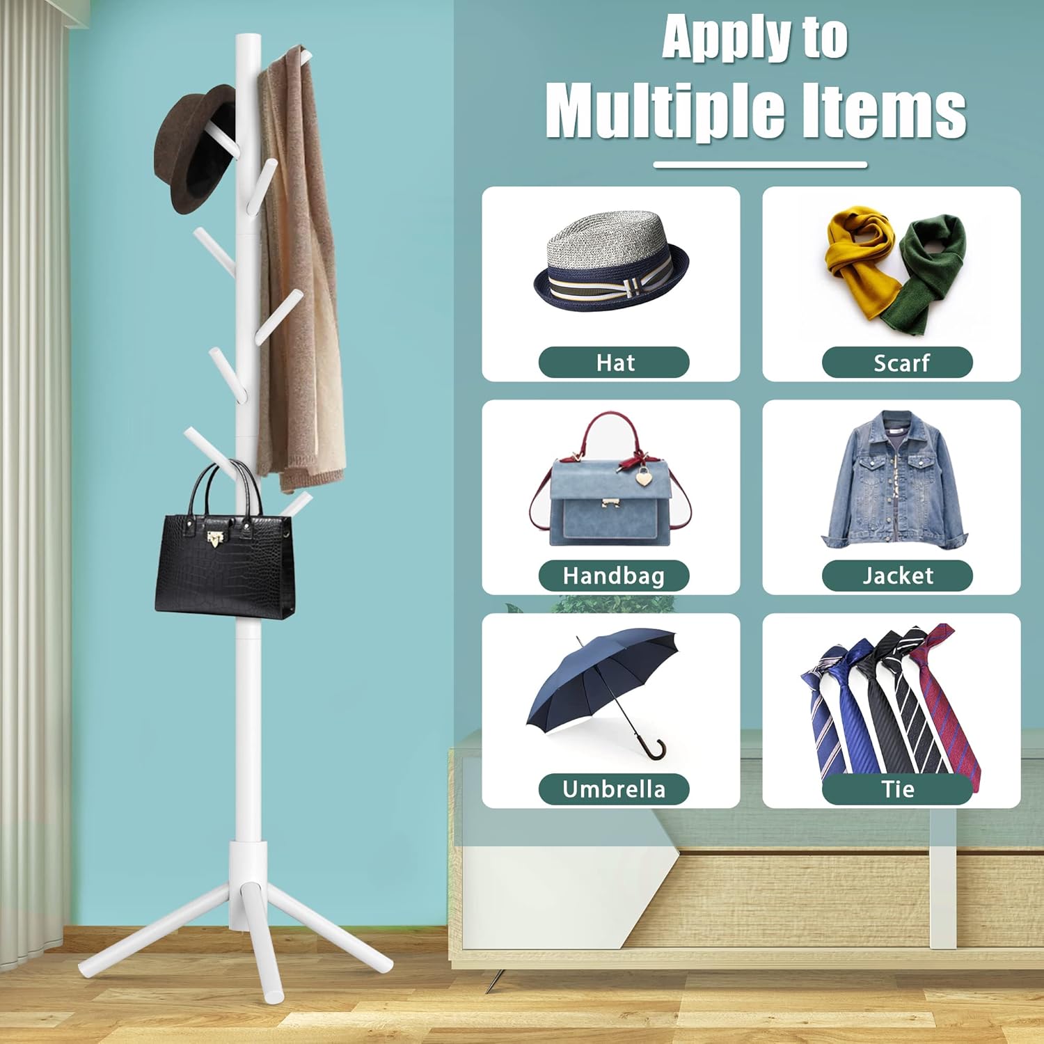 Haddockway Wooden Coat Rack Stand with 8 Hooks New Zealand Pine 3 Adjustable Coat Standing Tree Easy Assembly for Coats, Hats, Scarves and Handbags for Entryway, Hallway, Bedroom, Office, white