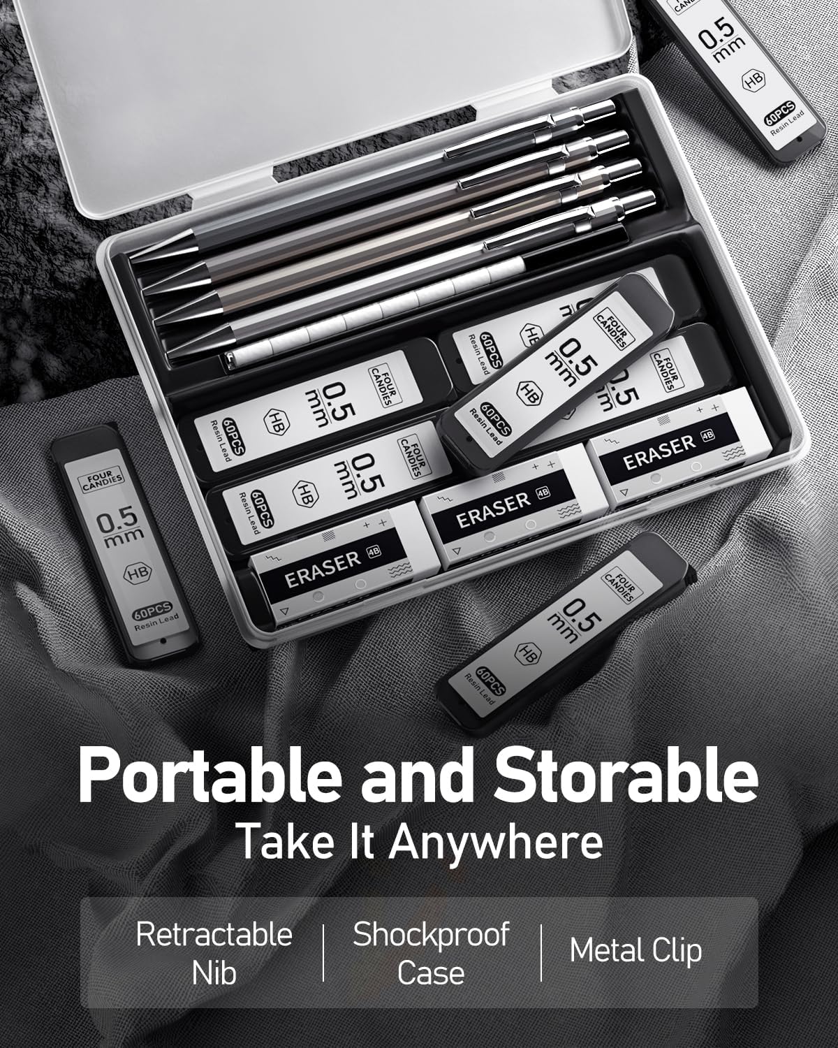 Four Candies 0.5mm Mechanical Pencil Set with Case - 4PCS Metal Mechanical Pencils, 8 Tubes HB #2 Lead Refills, 3PCS 4B Erasers and 9PCS Eraser Refills, Lead Mechanical Pencils for Writing & Drawing