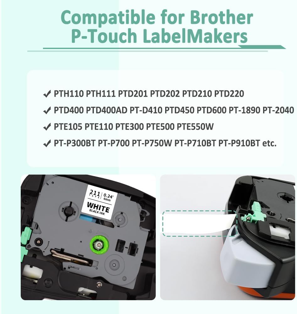 - Compatible with Brother P touch label makers that use 6mm tapes: PT-1230PC, PT-1280, PT-1290, PT-1880, PT-H100, PT-D200, PT-D210, PT-D400, PT-D400AD, PT-D450, PT-2030, PT-2430PC, PT-P700, PT-P750W, PT-D600, PT-2730, GL-100, GL-H100, PT-1000, PT-1010, PT-1090, PT-1100, PT-1120, PT-1130, PT-1160, PT-1170, PT-1180, PT-1190, PT-1200, PT-1300, PT-1400, PT-1500, PT-1500PC, PT-1600, PT-1700, PT-1750, PT-1800, PT-1810, PT-1830, PT-1880C, PT-1900, PT-200, PT-2030AD, PT-2100, PT-P300BT and more