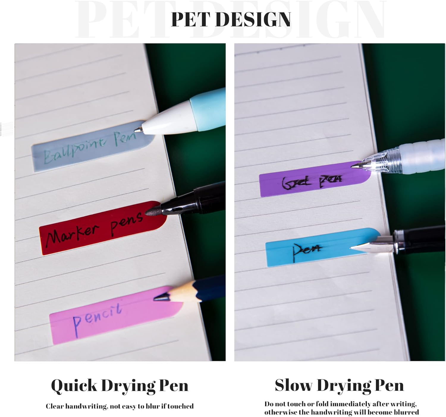 - [WRITABLE AND POSITIONABLE]The label is half self-adhesive, and can be repositioned for easy pasting and marking, and clean up. Different pens bring different effects to the sticky notes, (easy-dry pens: ballpoint pens, pencils, markers; difficult-to-dry pens: fountain pens, gel pens, ink-based pens, etc).