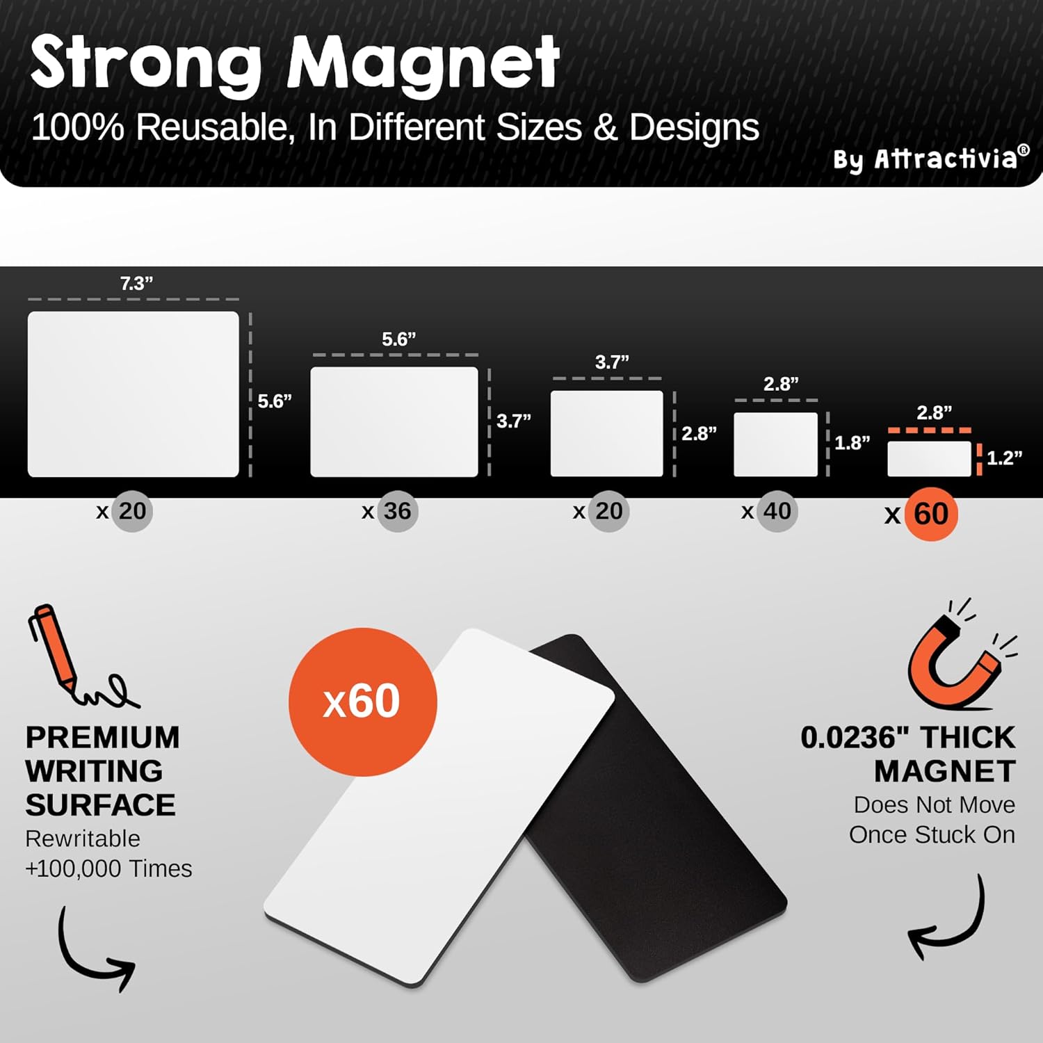 - Instant Organization: Our set of 60 dry erase magnetic labels is perfect for creating writable noticeboards or labeling items at home, in the office, or in a store. These dry erase magnetic labels for dry erase board are also ideal for sorting, identifying, organizing with ease, as magnetic name tags reusable, dry erase magnetic name plates and dry erase stickers.