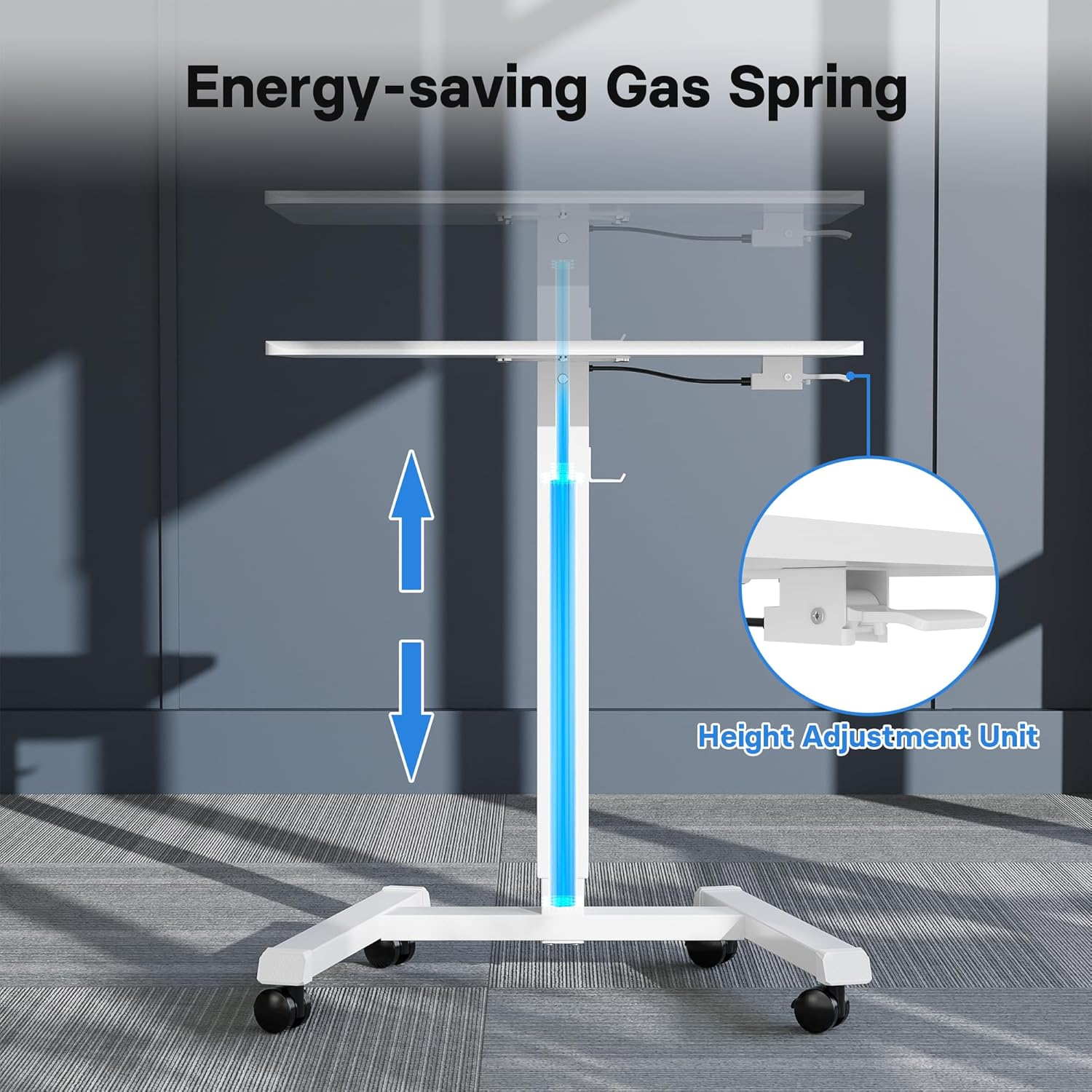 - ADJUSTABLE HEIGHT AND FUNCTIONAL DESIGN: The stand up desk features a gas spring lift system that provides smooth height adjustments, creating a sit to stand desk that adapts to different needs. The 25.6 x 17.7 inch desktop offers space for a laptop and essentials, while a 9.6inch slot holds tablets, phones, or pens. The 3.7inch base of the stand up desk allows this mobile desk to serve as an overbed rolling table for added versatility.