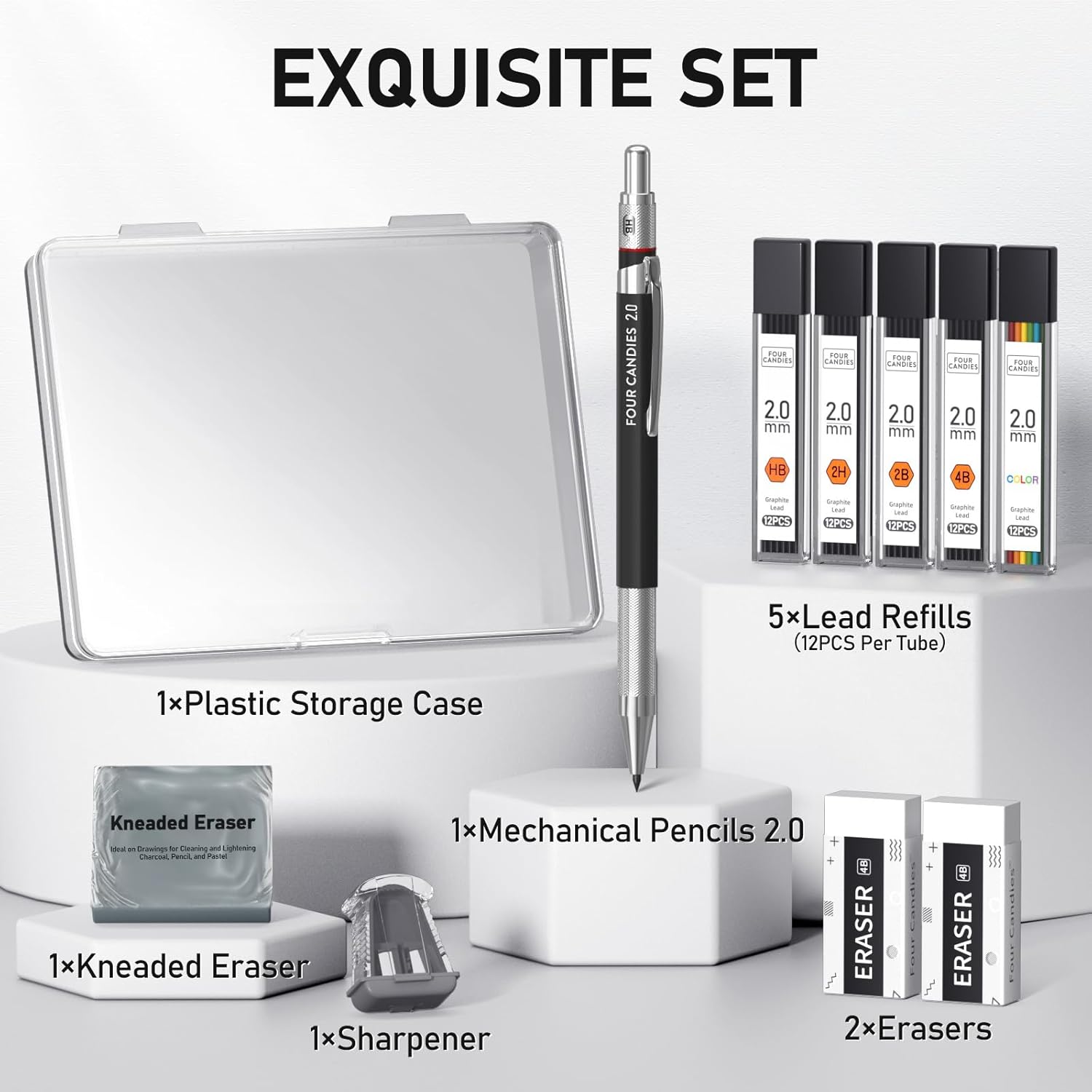 Four Candies 2MM Mechanical Pencil Set with case, Artist Led Pencil Metal Lead Holder with 60PCS Graphite Lead Refill (HB, 2H, 2B, 4B, Color) Kneaded Eraser, Sharpener for Writing, Drawing, Sketching
