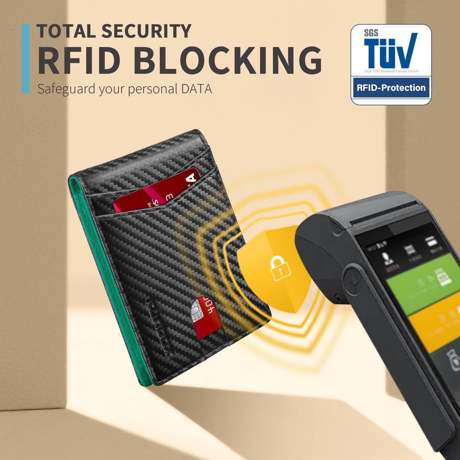 • RFID Blocking - Our wallets are equipped with advanced RFID SECURE Technology, a unique metal composite, engineered specifically to block 13.56 MHz or higher RFID signals and protect the valuable information stored on RFID chips from unauthorized scans. License and ID cards will be protected effectively. Blocking the 13.56 MHz band and protect against data theft by RFID scanners