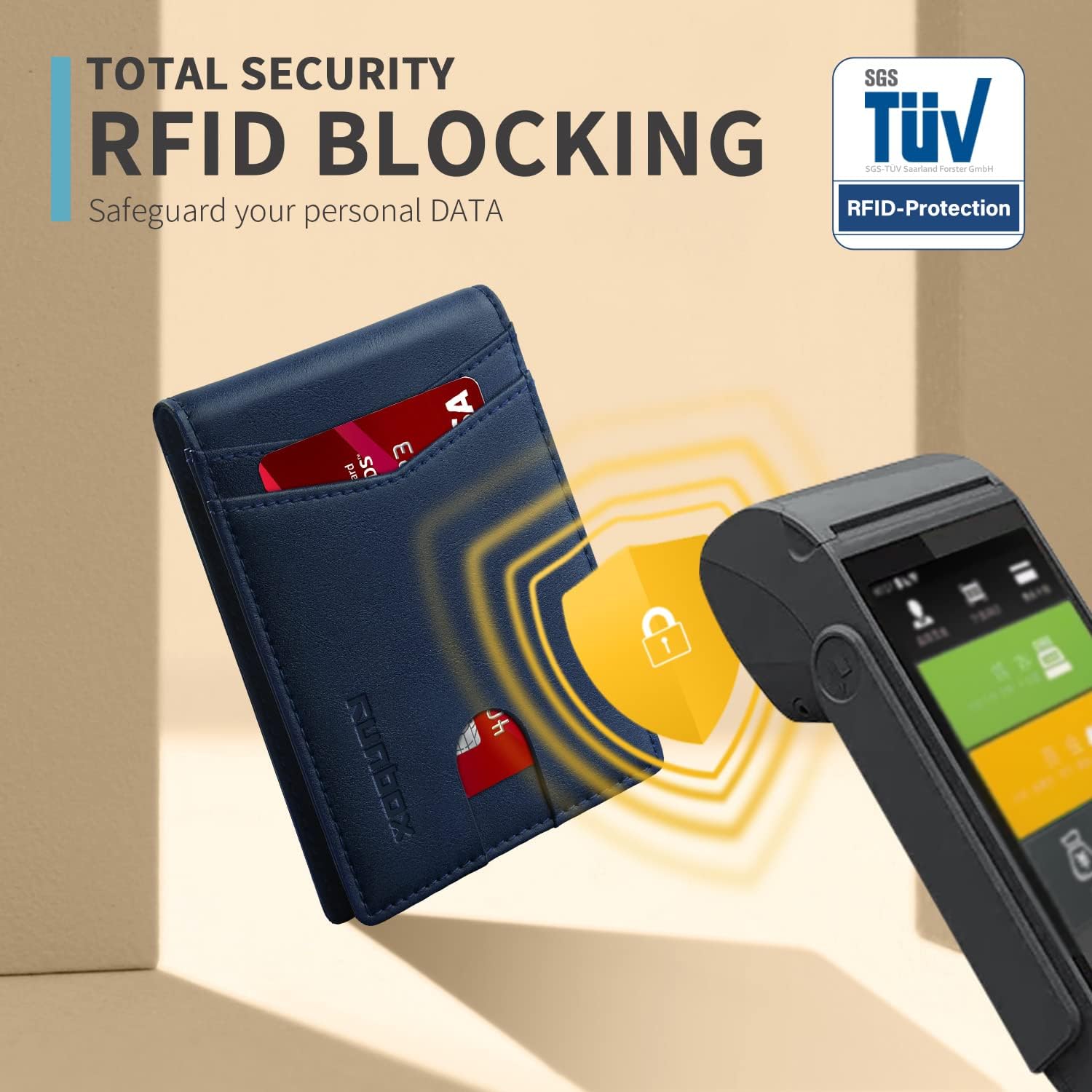 - RFID Blocking - Our wallets are equipped with advanced RFID SECURE Technology, a unique metal composite, engineered specifically to block 13.56 MHz or higher RFID signals and protect the valuable information stored on RFID chips from unauthorized scans. License and ID cards will be protected effectively. Blocking the 13.56 MHz band and protect against data theft by RFID scanners