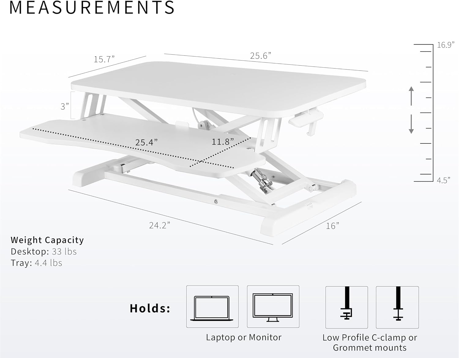 - Space Efficient 26" Surface: The top surface measures 25.6” x 15.7”, which will easily fit in your workspace. The 25.4” x 11.8” (11” in center) keyboard tray raises in sync with the top surface to create a comfortable workstation