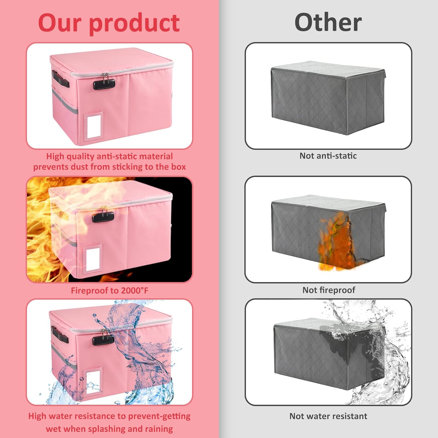 - Fireproof and water-resistant safe: The exterior material of Fireproof File Box is made of upgraded anti-static silicone coated fiberglass, which can withstand temperature up to 2000℉. Fireproof Document Box is not only fireproof but also highly water-resistant, so you don't have to worry about your important documents getting wet by rain.(Does not include folders)