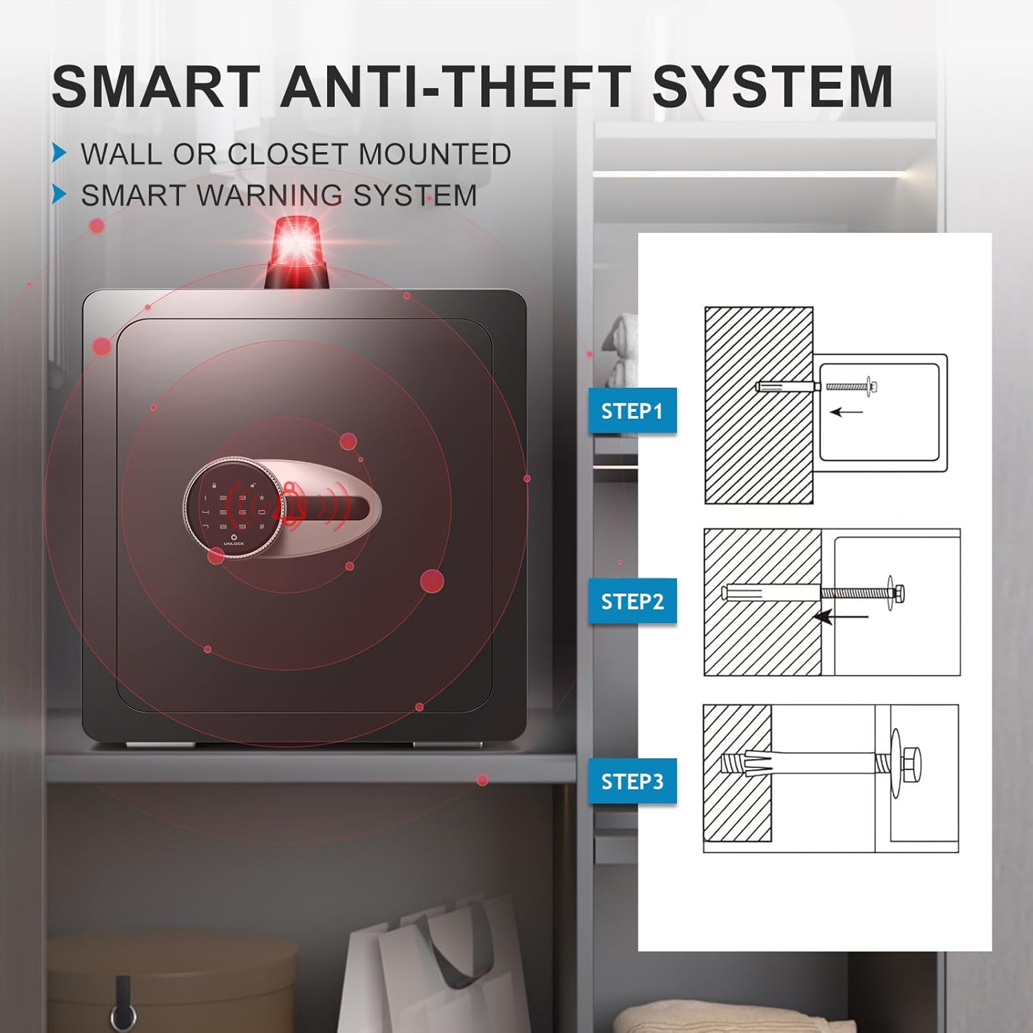 - 【SECURE AND PRACTICAL HOME SAFE】This home safe is made of low carbon alloy steel. Four solid lock bolts and pry-resistant micro seam design provide physical protection against forced entry. Pre -drilled hole design make you easily fix the safe to the wall or floor, improves safety and reliability.