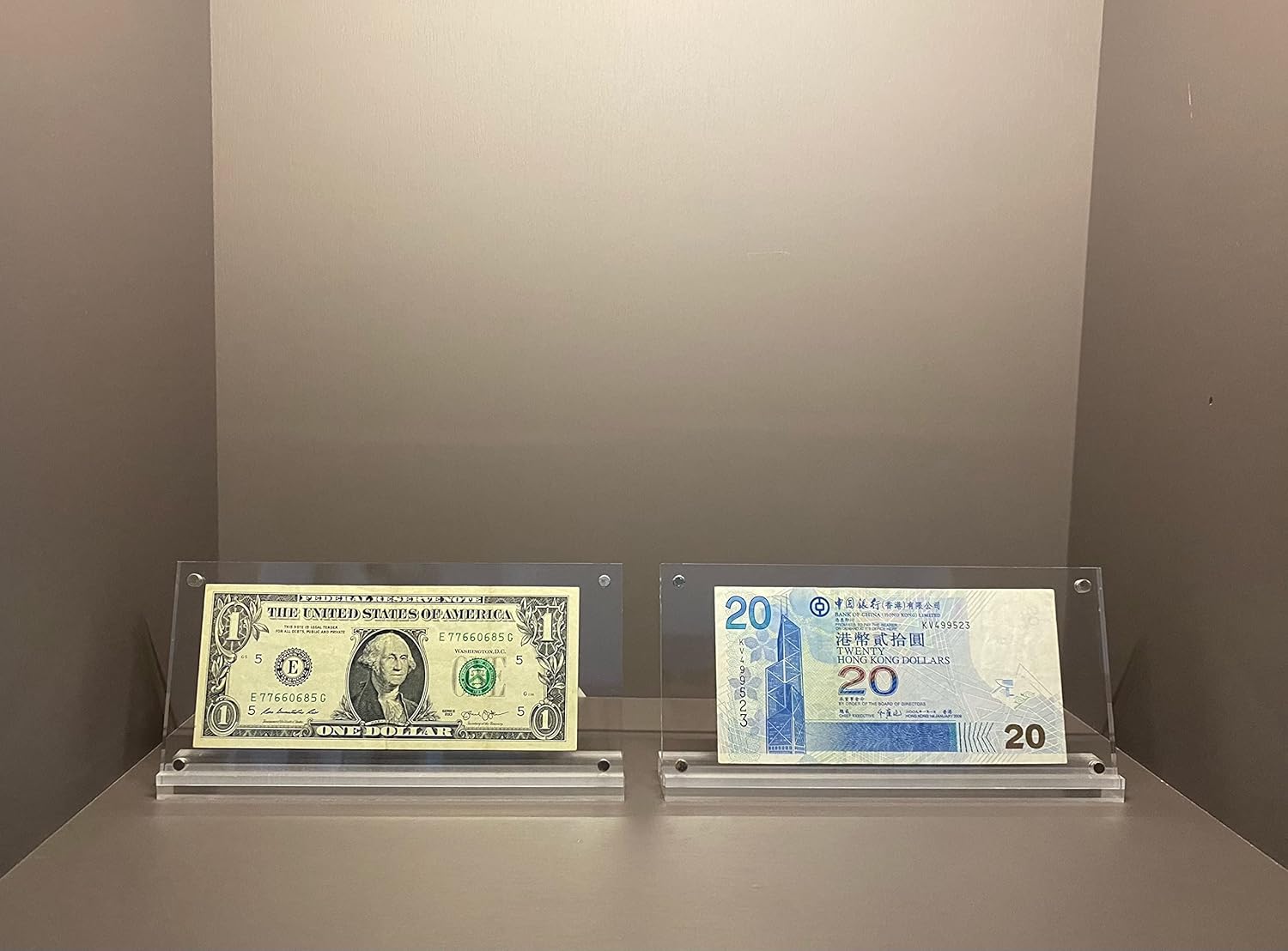 - WIDELY USED: Clear 7.3x3.5 inch acrylic frame with base supports,designed for photos,paper currency,pictures,stamps,paintings or other paper items and arts,real estate licenses and bank checks; a smaller size picture or currency will leave a border for a floating effect and makes your bill display stand out,only for tabletop or desktop display
