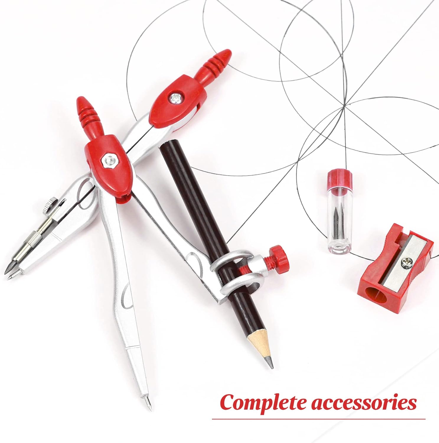 - A Practical Compass Geometry Set:Long-Lasting metal compasses will not bend, Ergonomically designed compass head is comfortable to hold, Universal Holder Compass work with any standard sized pencil or pen