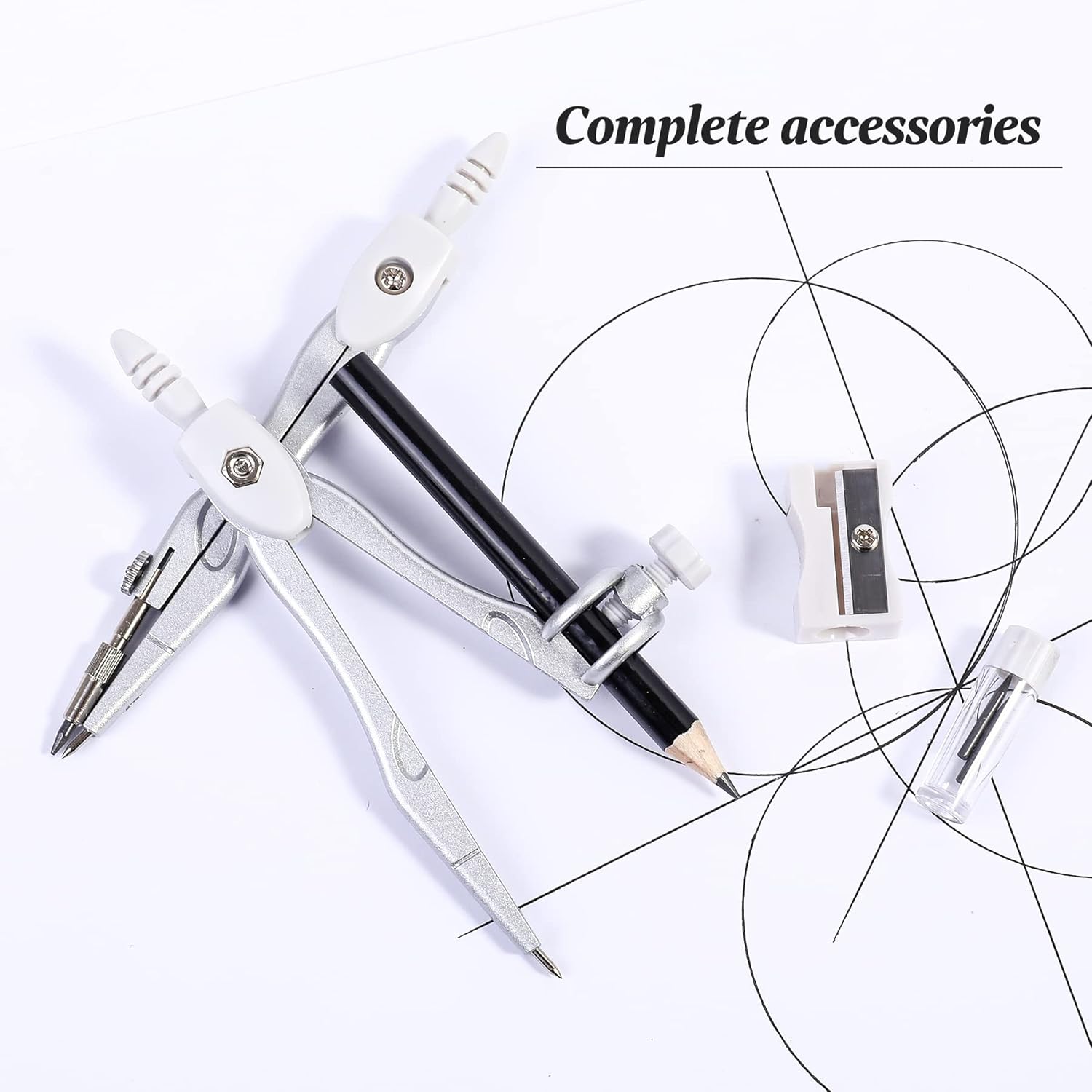 - A Practical Compass Geometry Set:Long-Lasting metal compasses will not bend, Ergonomically designed compass head is comfortable to hold, Universal Holder Compass work with any standard sized pencil or pen