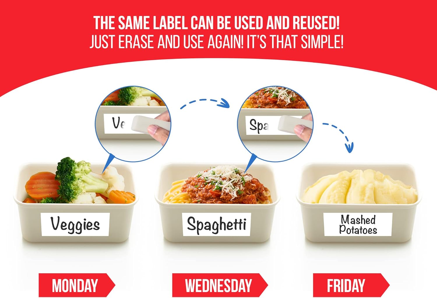 - Easy as Pie - Simply write-on your message with a permanent marker. When finished with the contents of the container, erase with any eraser. Wipe clean and re-use. Even use as labels for bottles.