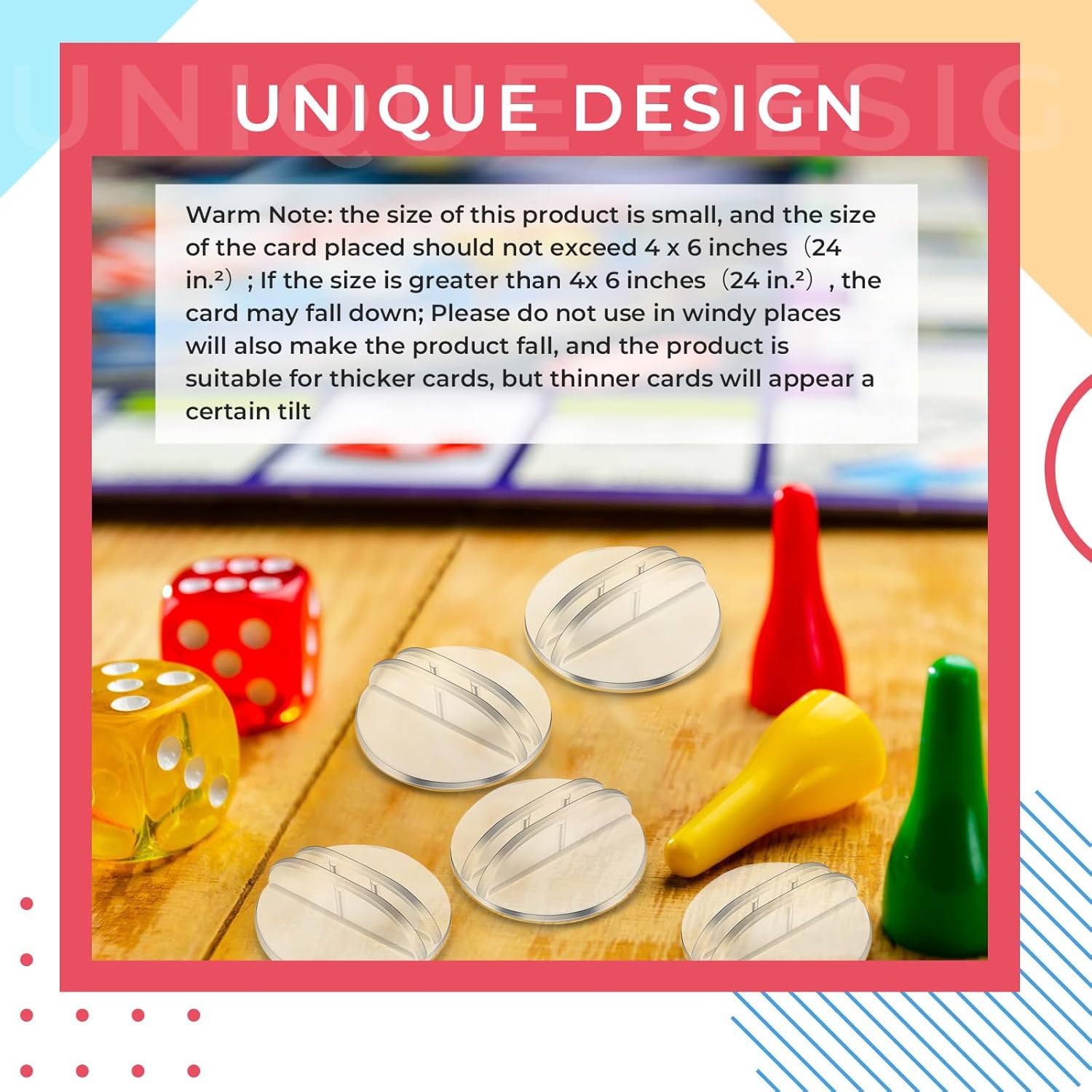 - Warm reminder: The product is made of plastic, small and lightweight. The size of the card placed should not exceed 4 x 6 inches or be too heavy; otherwise, the card slot may tip over. Do not use it in windy places either. The wind can also cause the product to tip over.
