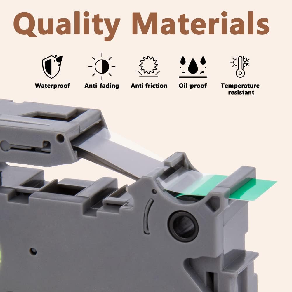 - Product features - The replacement compatible for Brother p-touch label tape 18mm TZe-741 is split back, water resistant, fading resistant, abrasion resistant, temperature resistant, strong adhesive. The ptouch label tape 18mm tze741 black on green tape is suitable for indoor and outdoor use.