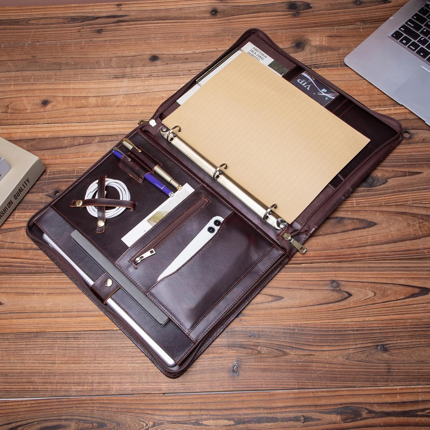 - Effortless Organization: Stay impeccably organized with 4 card slots, 1 clear card slot, and 2 pen slots for your business cards and writing instruments. The built-in cell phone holder keeps your phone accessible yet secure. Utilize the small inside YKK zippered pocket for confidential items, and keep your USB cables tangle-free with the dedicated USB cable holder.
