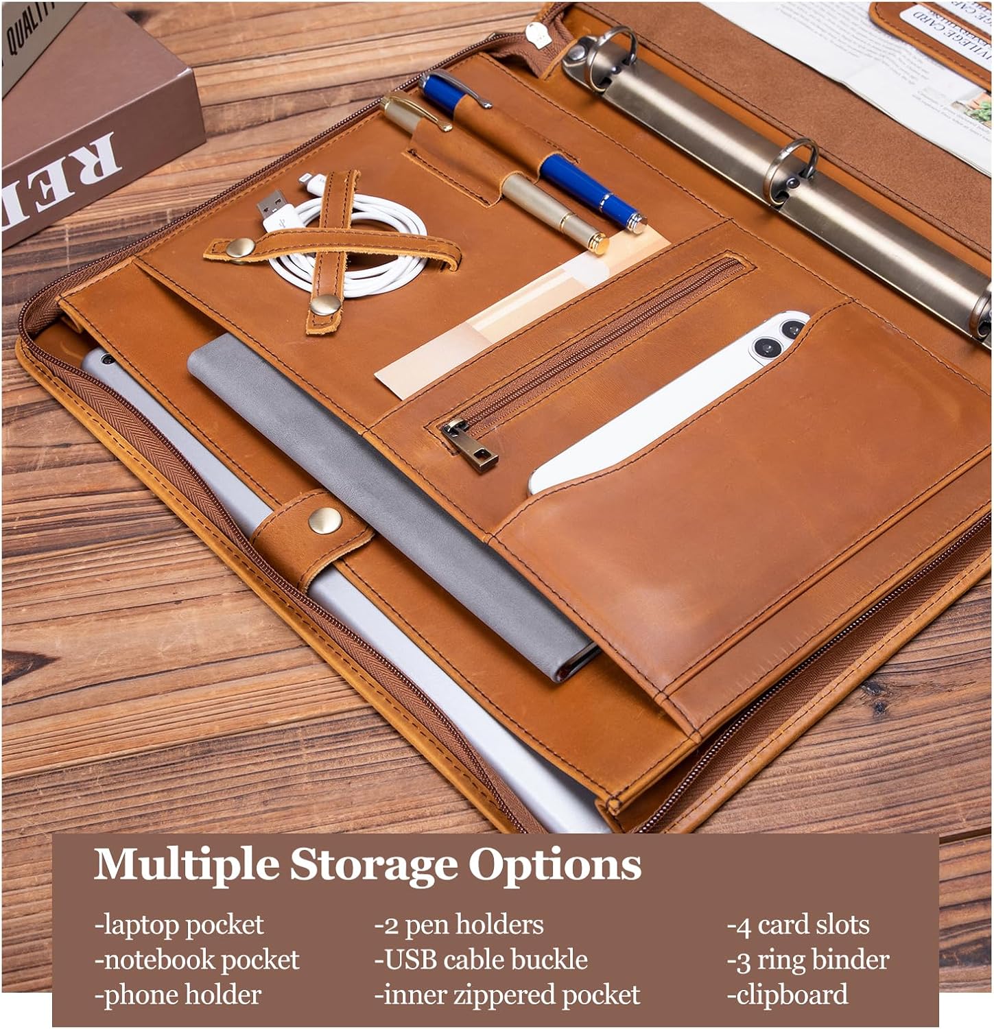 Genuine Leather Portfolio 3 Ring Binder with Clipboard, Hidden Handle, 8.5 x 11 Zippered Padfolio, Business Organizer Professional Executive Folio for Men and Women, Brown