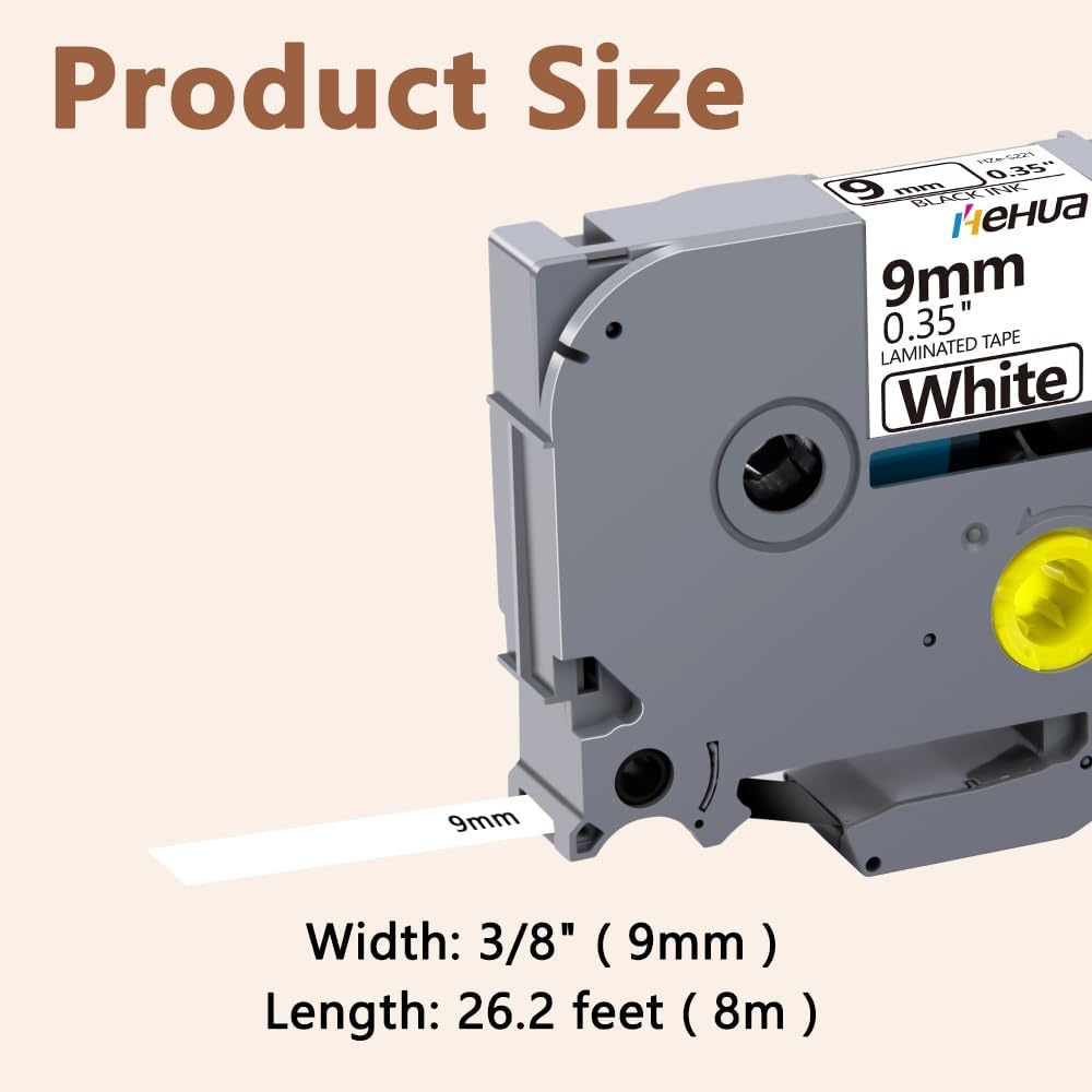 Hehua 9mm 0.35 Extra Strength Adhesive Laminated White Tape Compatible for Brother TZe-S221 TZeS221 TZ-S221 TZS221 for Ptouch PT D210 D200 H110 H100, 3/8'' x 26.2ft Black on White, 4 Pack