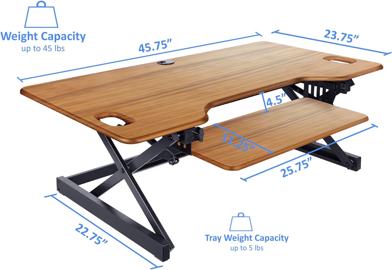 - EXTRA LARGE WORK SURFACE: 45.75" wide by 23.25" deep desktop holds up to 3 medium sized monitors or two large monitors and the 25.75" wide by 11.25" deep retractable keyboard tray will hold a laptop if needed. Works with optional Deluxe Floor Stand (DADR-FS) to create a complete standalone standing desk.