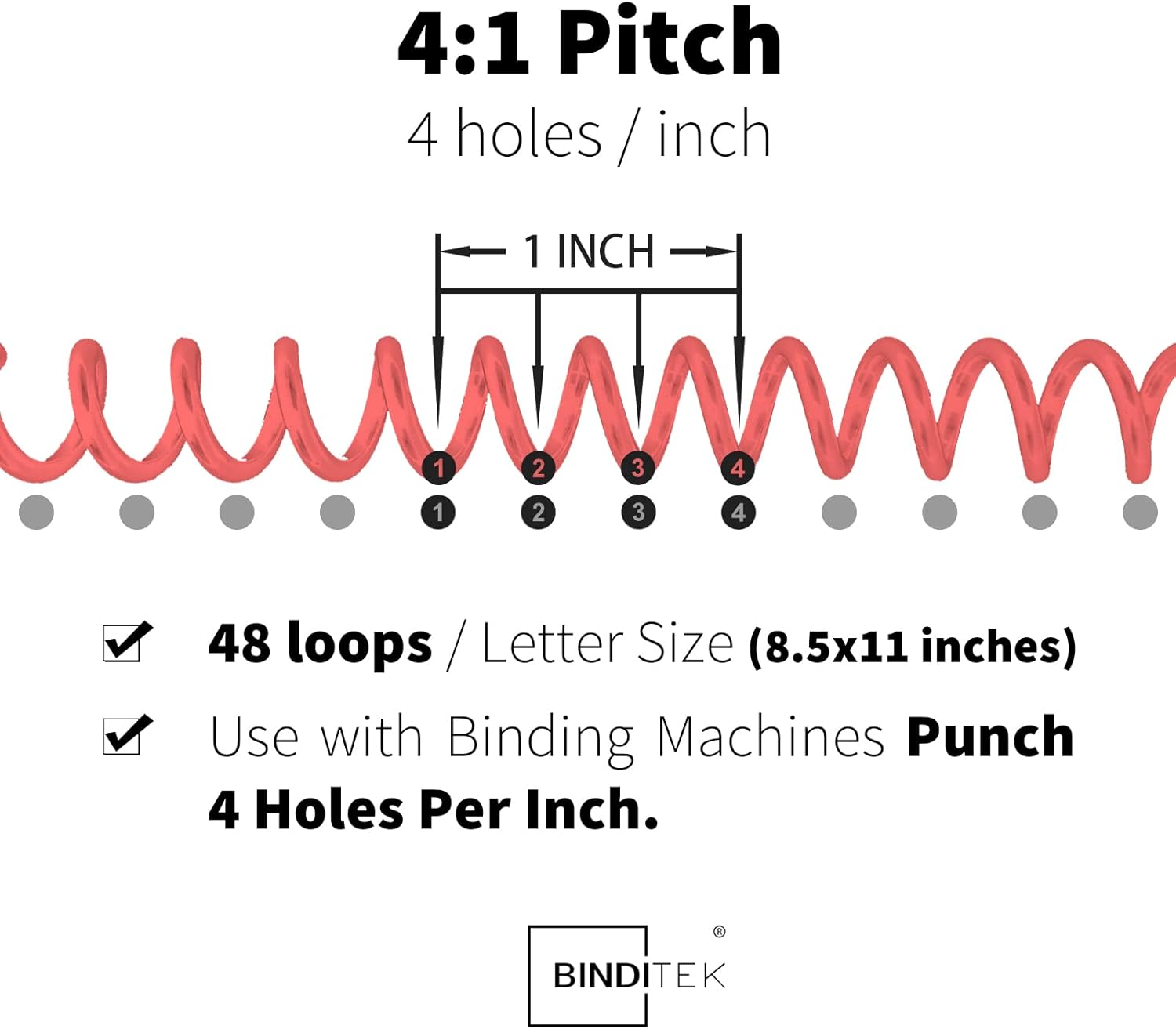 - 【4:1 Pitch & 48 Loops】Spiral binding coils have a 4:1 Pitch, compatible with any coil-binding machines that punches 4 holes per inch. (Attention: These 4:1 pitch binding coils are not compatible with the Cinch machine.)