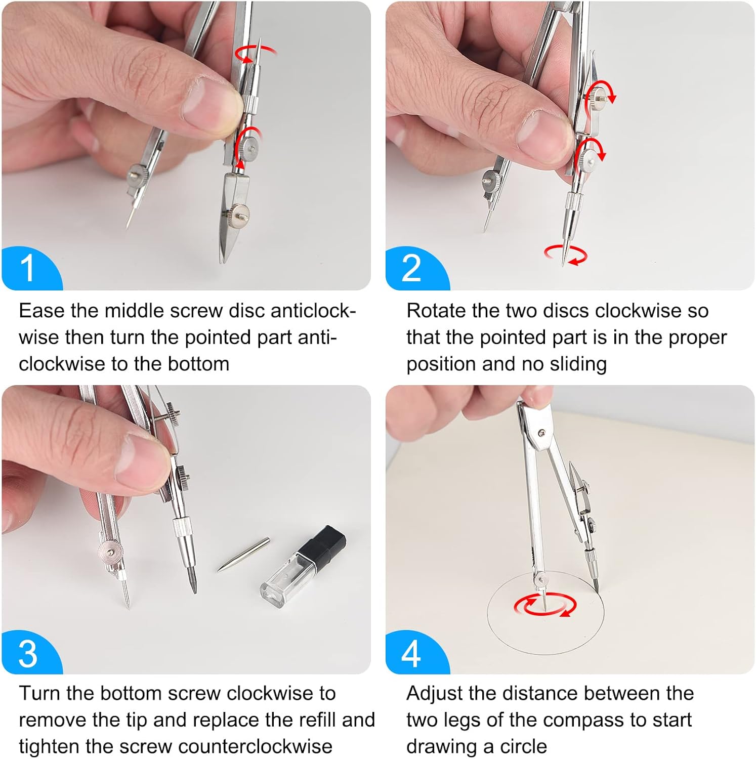 - Note: if you receive the compass protractor set and found the screw of compass is loose, do not worry, it is not a quality problem; The loose screw makes it easier for you to turn the pencil refill down; You can tighten the screw after using pencil refill replace divider part