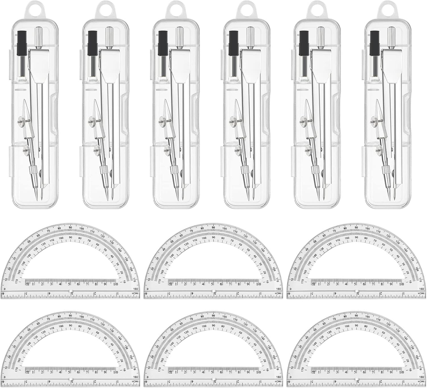 6 Sets Compass and Protractor Sets Student Basics Geometry Math Set Metal Compass and 6 Inch 180 Degree Protractors Geometry Graphing Drawing Tools for Office and School Supplies(Clear)