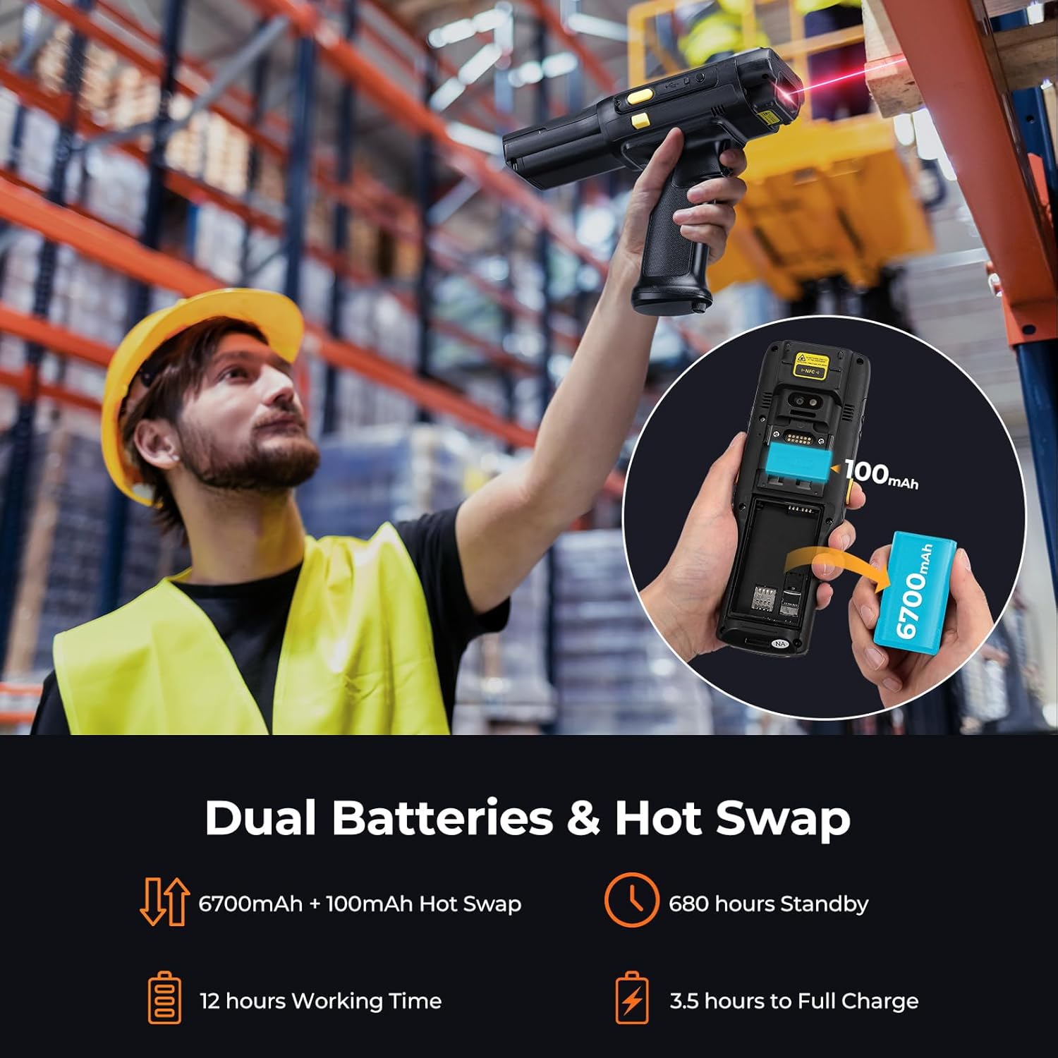 - [6700mAh Battery]: 3.5 hours charging time is for over 12 hours continuous scanning work. This 2D android scanner powered by a 6700mAh removable battery supports “Quick Charge 3.0” and RTC; a Built-in 100mAh backup battery enables this zebra scanner to support “battery hot swap”, improving reliability and ensuring user data security. (Please use a standard adaptor and USB cable). [Important] Please use the original charger otherwise the machine will not be charged or even be damaged
