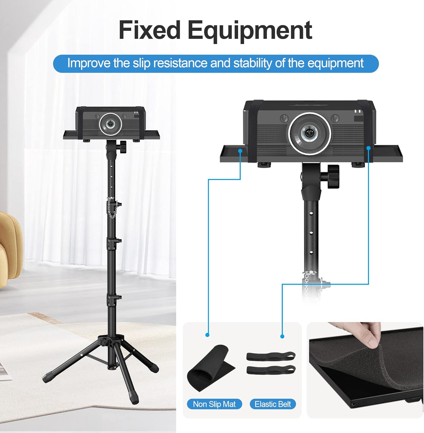 - High Weight Bearing Projector Stand Tall: with a maximum load capacity of 22lbs, we did a lot of experiments to increase the load capacity of the projector tripod stand. Finally, we chose to make this new projector stand adjustable by increasing the height of the load point and using a non-slip tripod with adjustable angle