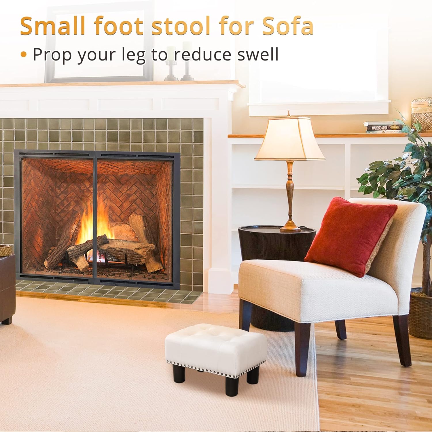 LUE BONA Small Tufted Foot Stool, Beige Rivet Fabric Ottoman with Plastic Legs, 9''H, Rectangle Footstool for Adult with Non-Slip Pads, Sofa Foot Rest for Living Room, Couch