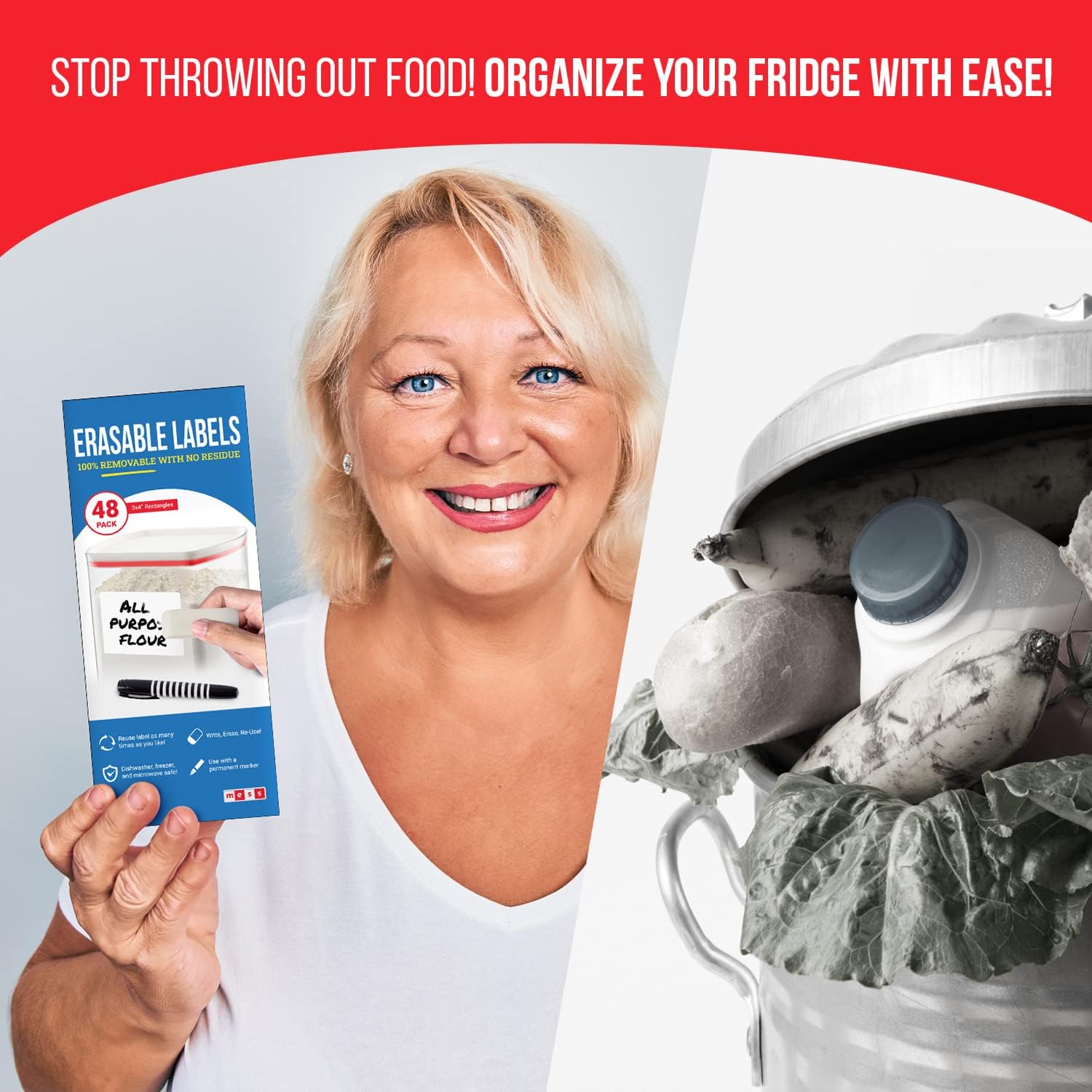 MESS Reusable Kitchen Labels – White Dry Erase, 3x4 in, 48-Pack – Erasable Organizing Stickers for Fridge & Freezer