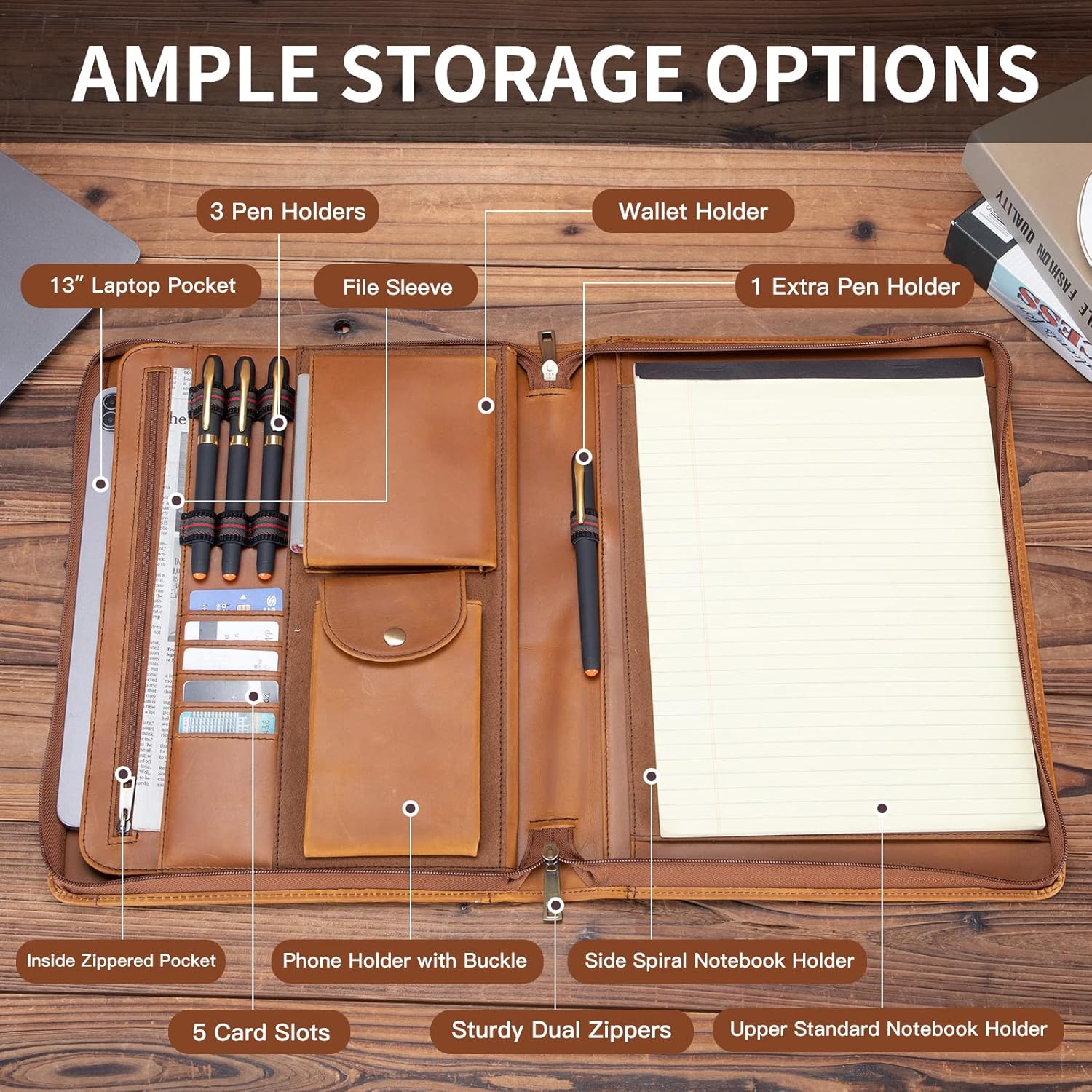 - Large Capacity for More Papers: The leather portfolio is thick with enough room and multiple pockets so you can carry more files and paper inside. Friendly to store paper and easy to close without bulges. The dual YKK zippers enclosure makes it smooth to zip. No more worry about damaging paper or stuck zipper.